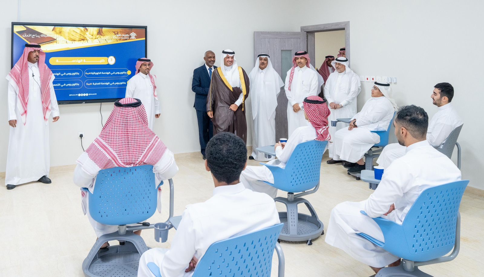 واطّلع سموّه على الإمكانات التدريبية والتعليمية المتوفرة، حيث تجول بالقاعات الدراسية والمختبرات والمعامل، واستمع إلى شرح مفصل من عمداء الكليات حول البرامج الأكاديمية والخطط التطويرية التي تهدف إلى رفع جودة التعليم وتحقيق مخرجات متميزة تتماشى مع مستهدفات رؤية المملكة 2030.