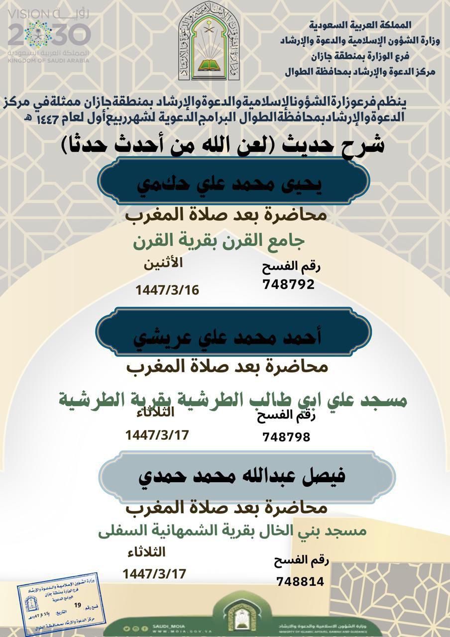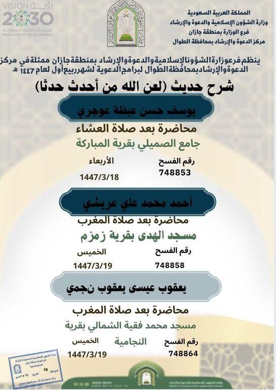يواصل فرع وزارة الشؤون الإسلامية والدعوة والإرشاد بمنطقة جازان، ممثلاً بمركز الدعوة في محافظة الطوال، تنفيذ سلسلة من المحاضرات الدعوية بعنوان: “شرح حديث: لعن الله من أحدث حدثاً”، وذلك خلال الفترة من 15 إلى 19 من شهر ربيع الأول لعام 1447هـ.