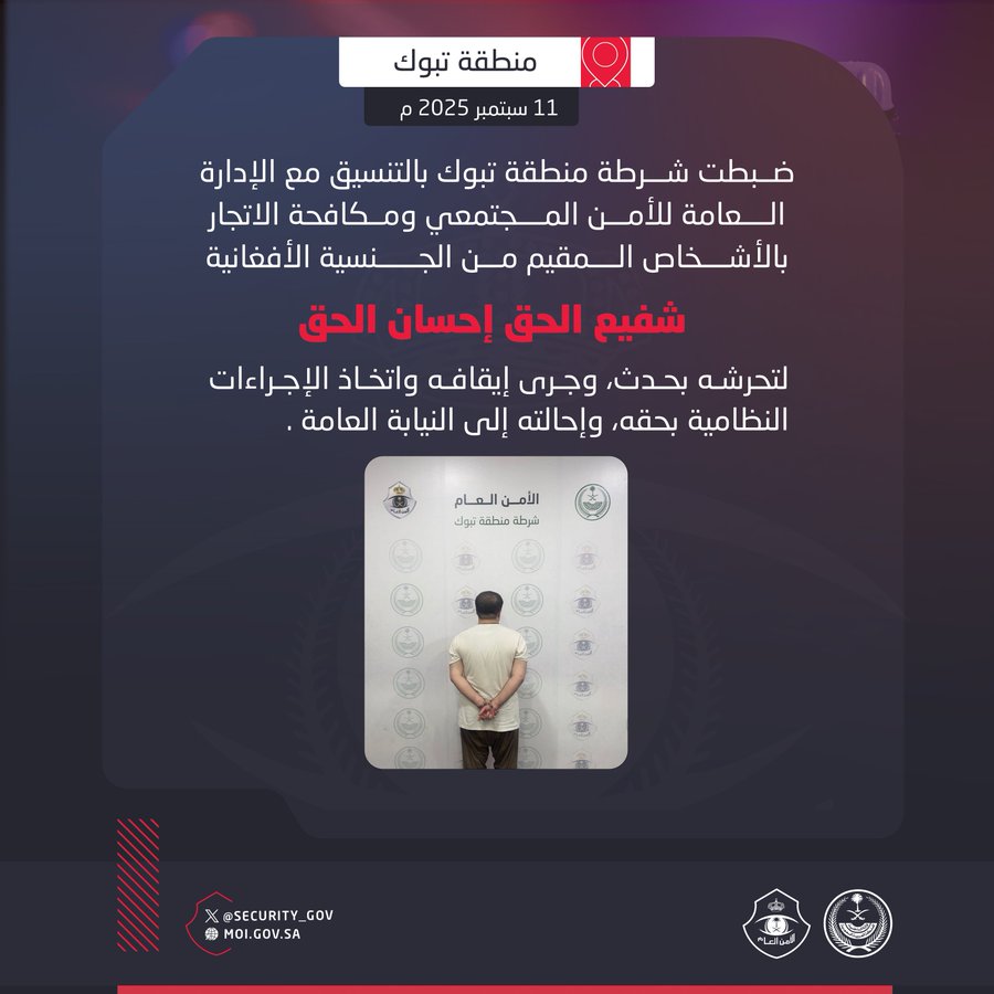 ضبطت شرطة منطقة تبوك، بالتنسيق مع الإدارة العامة للأمن المجتمعي والإدارة العامة لمكافحة الاتجار بالأشخاص، مقيمًا من الجنسية الأفغانية يُدعى شفيع الحق إحسان الحق، بعد ارتكابه جريمة تحرّش بحدث، حيث جرى إيقافه واتخاذ الإجراءات النظامية الأولية بحقه، تمهيدًا لإحالته إلى النيابة العامة لاستكمال المسار القضائي.
