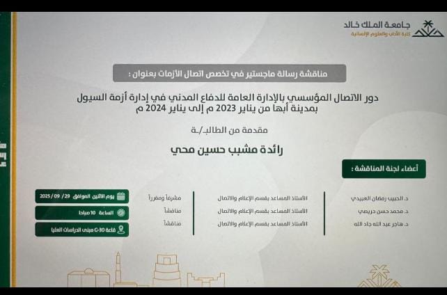 حصلت الطالبة رائدة مشبب حسين علي ال محي قرية آل الداحس بمحافظة أحد رفيدة بمنطقة عسير على درجة الماجستير من جامعة الملك خالد كلية الآداب والعلوم الإنسانية قسم الاعلام و الاتصال عنوان الرسالة دور الاتصال المؤسسي بالادارة العامة للدفاع المدني في ادارة الازمات بمدينة أبها.