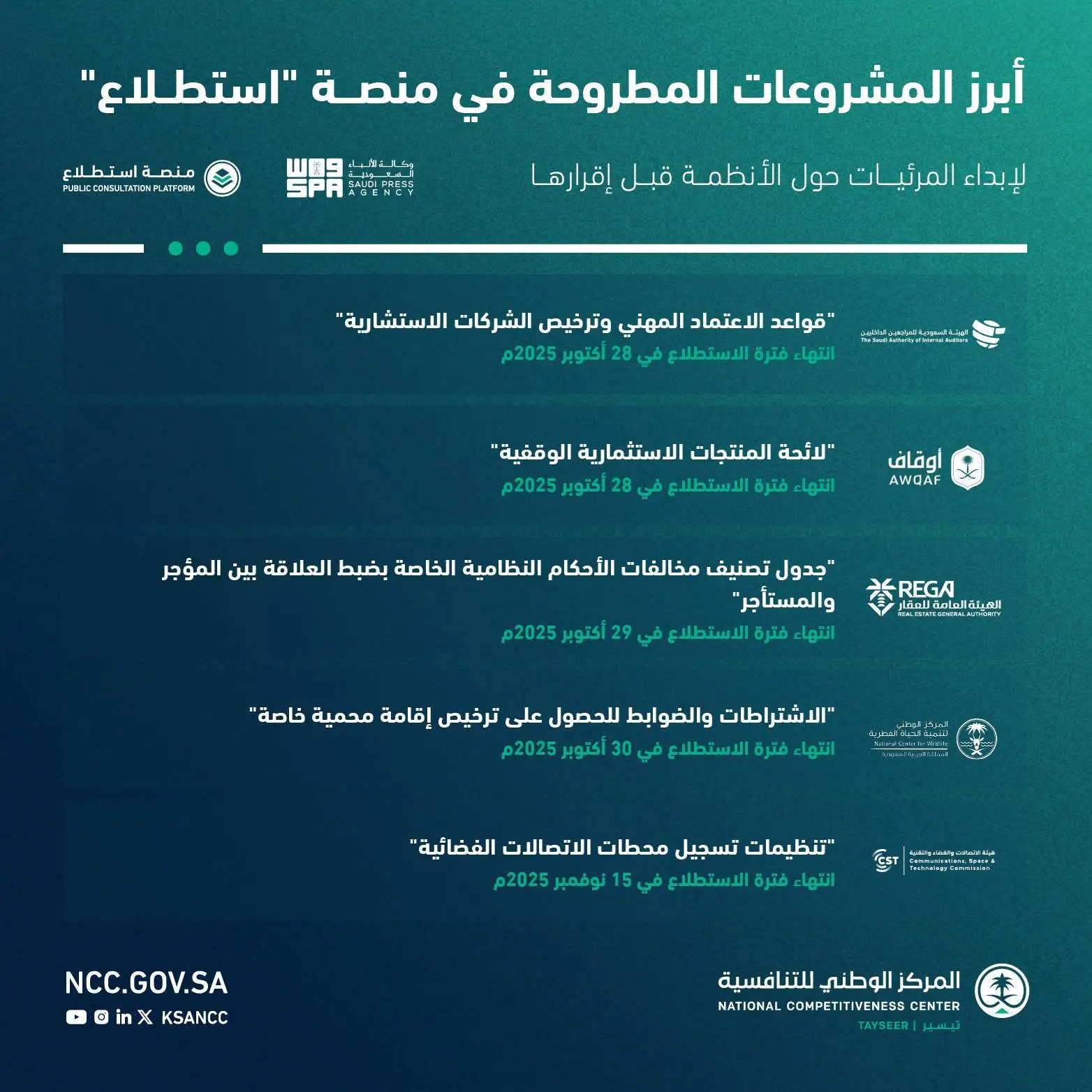 ويأتي طرح هذه المشروعات عبر منصة “استطلاع” في إطار تعزيز الشفافية في البيئة التشريعية، ونشر ثقافة المشاركة في صناعة القرار، إلى جانب تمكين العموم والجهات الحكومية والقطاع الخاص من الإسهام في تطوير الأنظمة واللوائح ذات العلاقة ببيئة الأعمال، بما يعزز جاذبية الاستثمار ويدعم مسيرة التنمية الاقتصادية في المملكة.