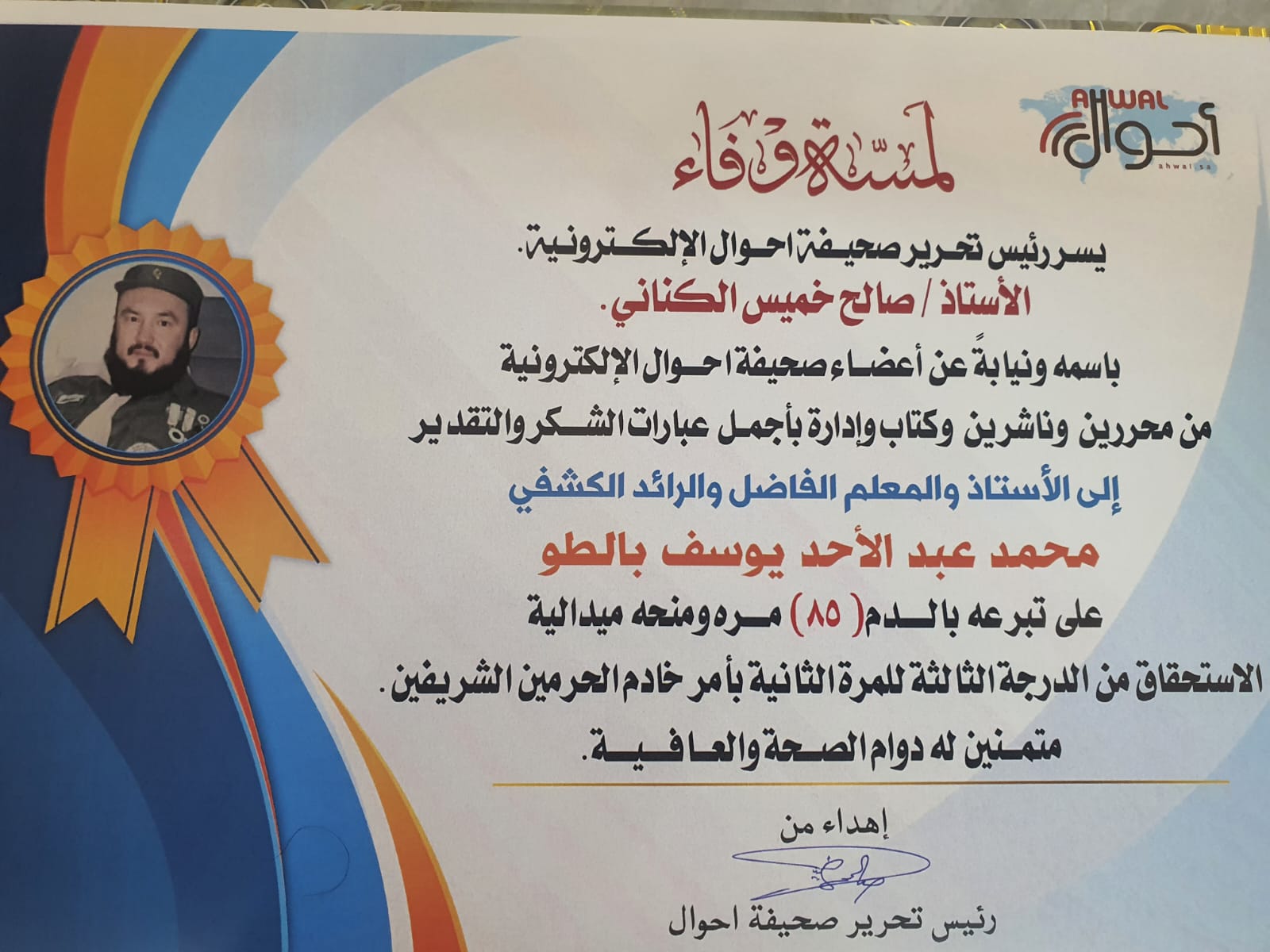 يتقدم رئيس تحرير صحيفة أحوال الإلكترونية الأستاذ صالح خميس الكناني، نيابةً عن المحررين والكتاب والناشرين والإداريين، بخالص الشكر والتقدير والعرفان للقائد الكشفي محمد عبد الأحد يوسف بالطو، وذلك تقديرًا لجهوده الإنسانية النبيلة وتبرعه المتكرر بالدم (85 مرة)، مسهمًا في إنقاذ أرواحٍ كثيرة ومساعدة العديد من المرضى.