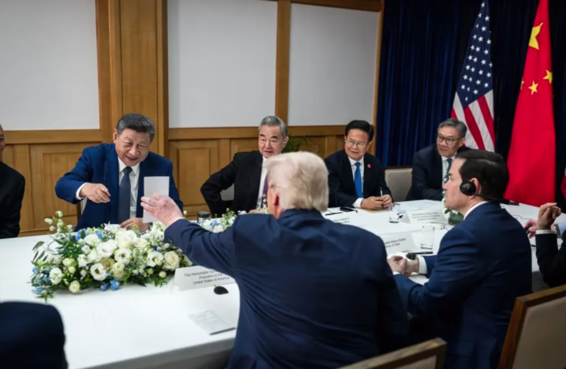 ففي غرفة مليئة بالدبلوماسيين ذوي البدلات الرسمية، ظهر ترامب في إحدى الصور ممددا ذراعه على طاولة المفاوضات ليُري شي ورقة، ولا يزال محتوى الورقة مجهولًا.