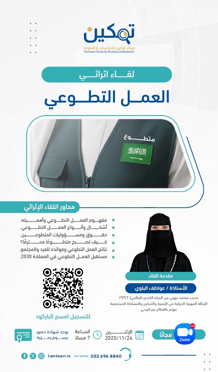 لقاء موجه لكل من يسعى لفهم العمل التطوعي بشكل أعمق، واكتساب مهارات احترافية تساهم في تعزيز دوره الفردي والمجتمعي.