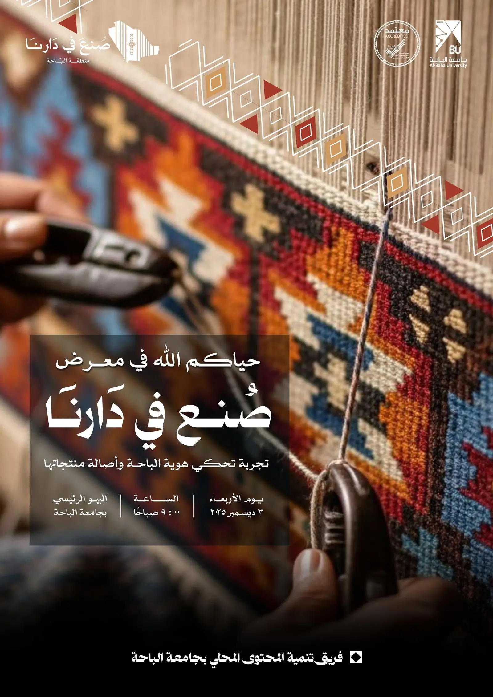 في خطوة نوعية تجسد تكامل الأدوار التعليمية والتنموية، وتؤكد حرص المؤسسات الأكاديمية على حماية الموروث الوطني وتعظيم الاستفادة منه، أطلق معالي رئيس جامعة الباحة الدكتور عبدالله بن يحيى الحسين، مبادرة «صُنع في دارنا»، التي ينفذها فريق تنمية المحتوى المحلي بالجامعة، بهدف إبراز المنتجات المحلية التي تزخر بها منطقة الباحة، وتعزيز حضورها في المشهد الاقتصادي الوطني، عبر تمكين الحرفيين وروّاد الأعمال، وتحويل الحِرف التقليدية والمنتجات التراثية إلى روافد إنتاجية مستدامة.