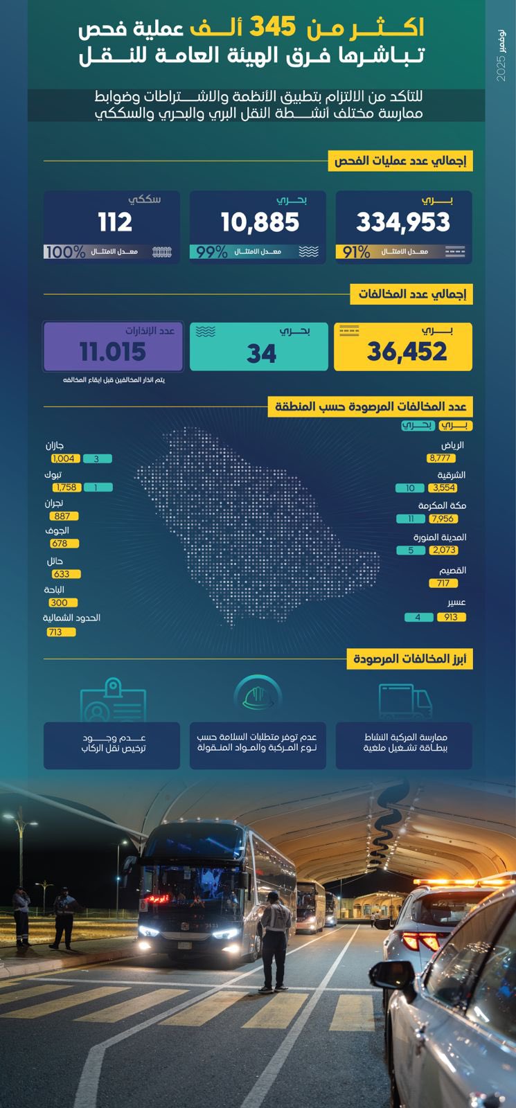 نفّذت الهيئة العامة للنقل، بالتعاون مع عدد من الجهات المعنية، أكثر من 345 ألف عملية فحص على أنشطة النقل البري والبحري والسككي خلال شهر نوفمبر 2025، في خطوة تهدف إلى التأكد من التزام الأفراد والمنشآت المرخصة بالأنظمة واللوائح، ورفع مستوى معدل الامتثال وجودة الخدمات.
