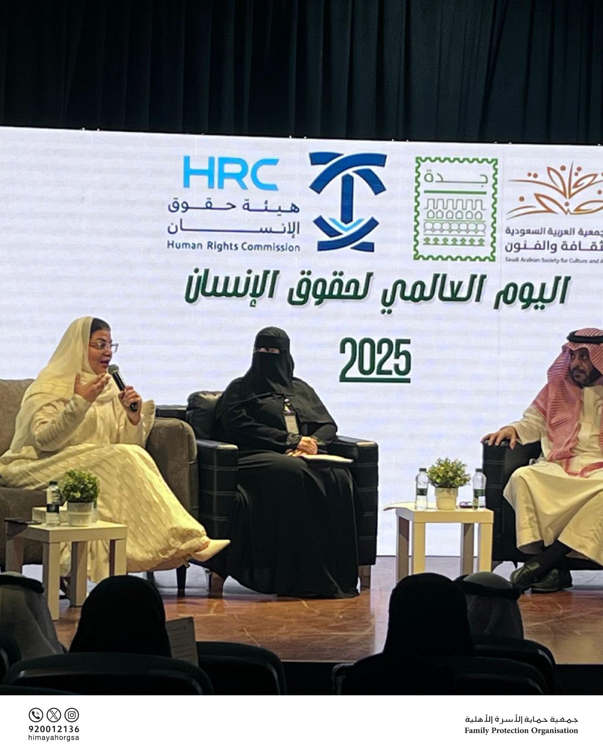 شاركت جمعية حماية الأسرة، ممثلةً برئيس مجلس الإدارة الأستاذة سميرة خالد الغامدي، بورقة عمل بعنوان «عمل مؤسسات المجتمع المدني»، وذلك ضمن ملتقى اليوم العالمي لحقوق الإنسان، الذي أُقيم بالتعاون مع فرع هيئة حقوق الإنسان بمحافظة جدة.