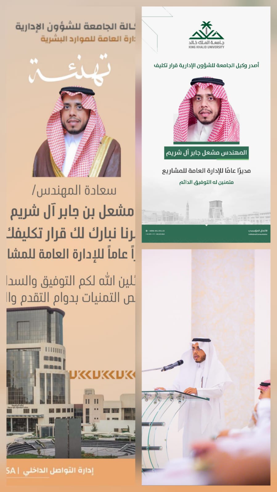 أصدر وكيل جامعة الملك خالد للشؤون الإدارية قرارًا بتكليف المهندس مشعل جابر آل شريم مديرًا عامًا للإدارة العامة للمشاريع بالجامعة، وذلك في إطار تطوير العمل الإداري وتعزيز الكفاءات الهندسية داخل الجامعة.