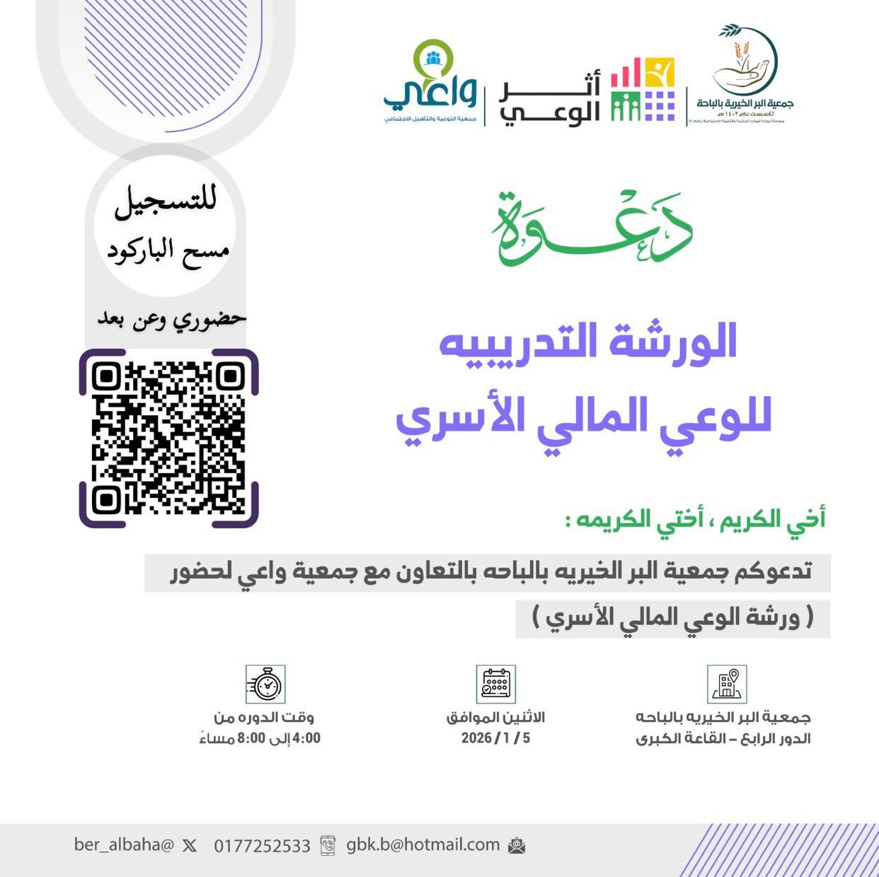 بحضور رئيس مجلس إدارة جمعية البر الخيرية بالباحة الدكتور :عبدالله بن علي أبو ملحة ، ومستشار النشر الاعلامي بمشروع أثر الوعي بجمعية واعي ؛ اختتمت الجمعية مبادرة ( الوعي المالي الأسري ) وذلك ضمن جهود جمعية البر الخيرية بالباحة لتعزيز الثقافة المالية في المجتمع ودعم تبنّي سلوكيات ادخارية صحيحة تسهم في تحسين جودة الحياة المالية للأفراد والمجتمع .