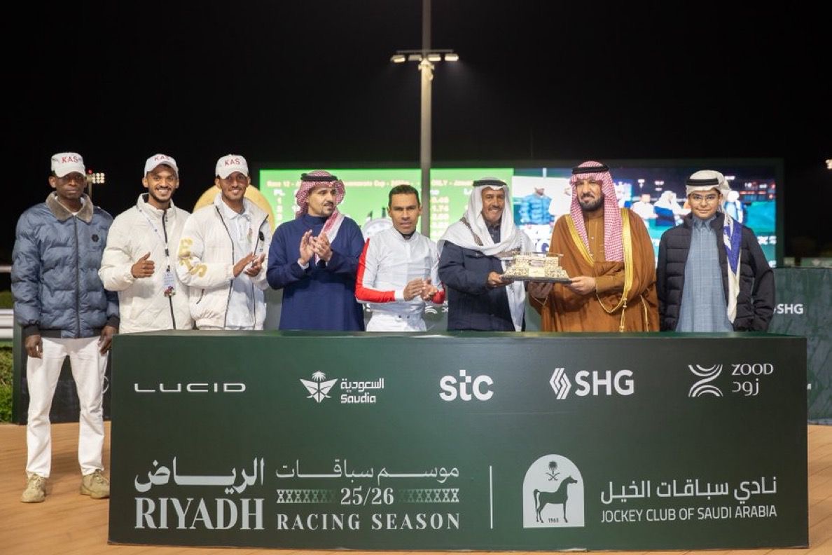 برعاية صاحب السموّ الملكي الأمير فيصل بن نواف بن عبدالعزيز أمير منطقة الجوف، سلّم وكيل إمارة المنطقة حسين بن محمد آل سلطان، اليوم، كأس إمارة منطقة الجوف للعام 1447هـ، للفائز في منافسات الشوط الثاني عشر الجواد «المقام»، المملوك لأبناء الملك عبدالله بن عبدالعزيز -رحمه الله-، وذلك في ميدان الملك عبدالعزيز للفروسية بالجنادرية في مدينة الرياض، ضمن منافسات سباقات الخيل لهذا العام.