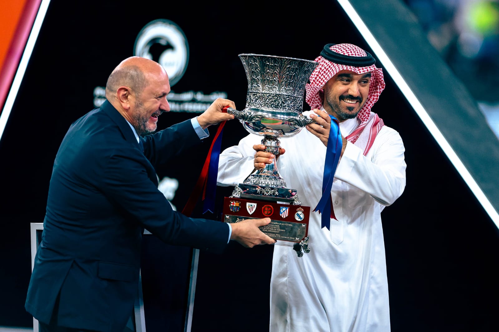 توَّج صاحب السمو الملكي الأمير عبدالعزيز بن تركي الفيصل؛ وزير الرياضة، رئيس اللجنة الأولمبية والبارالمبية السعودية، فريق برشلونة بكأس السوبر الإسباني لعام 2026، عقب فوزه على ريال مدريد بنتيجة (3-2)، في المباراة النهائية التي أُقيمت على ملعب الإنماء بمدينة الملك عبدالله الرياضية في جدة، وذلك بحضور رافائيل لوزان أبال رئيس الاتحاد الإسباني لكرة القدم، وعدد من قيادات الوزارة والاتحاد الإسباني، ومسؤولين رياضيين في القطاع الرياضي، وسط حضور جماهيري كبير جداً بلغ 60326 متفرجًا.