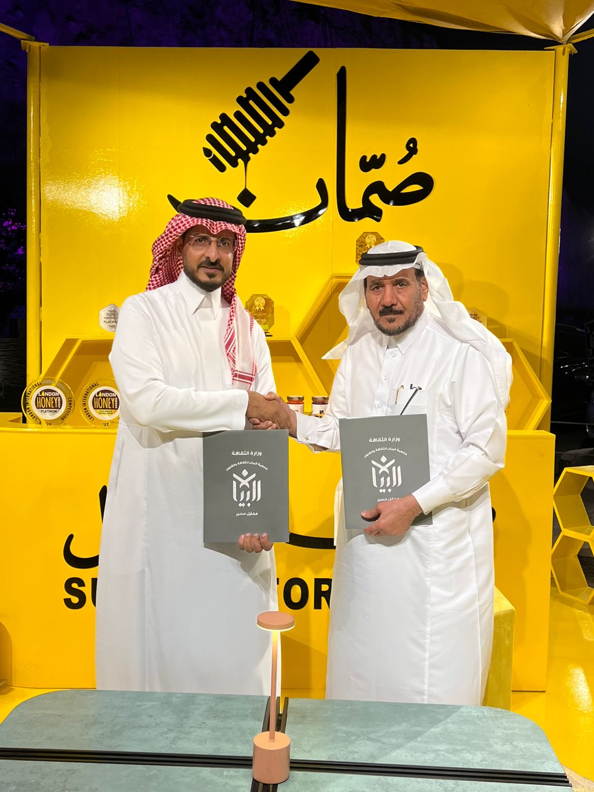 ومثّل الجمعية رئيسها الأستاذ حامد محمد الصافي ومؤسسة صمان للعسل ويمثلها الاستاذ علي محمد صمان