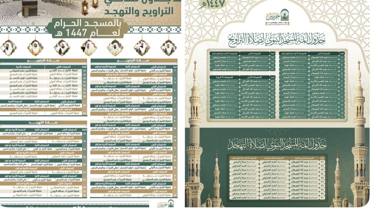 أعلنت رئاسة الشؤون الدينية بالمسجد الحرام والمسجد النبوي جدول صلاتي التراويح والتهجد في كلٍ من المسجد الحرام والمسجد النبوي لعام 1447هـ وذلك ضمن خطتها التنظيمية لموسم شهر رمضان المبارك