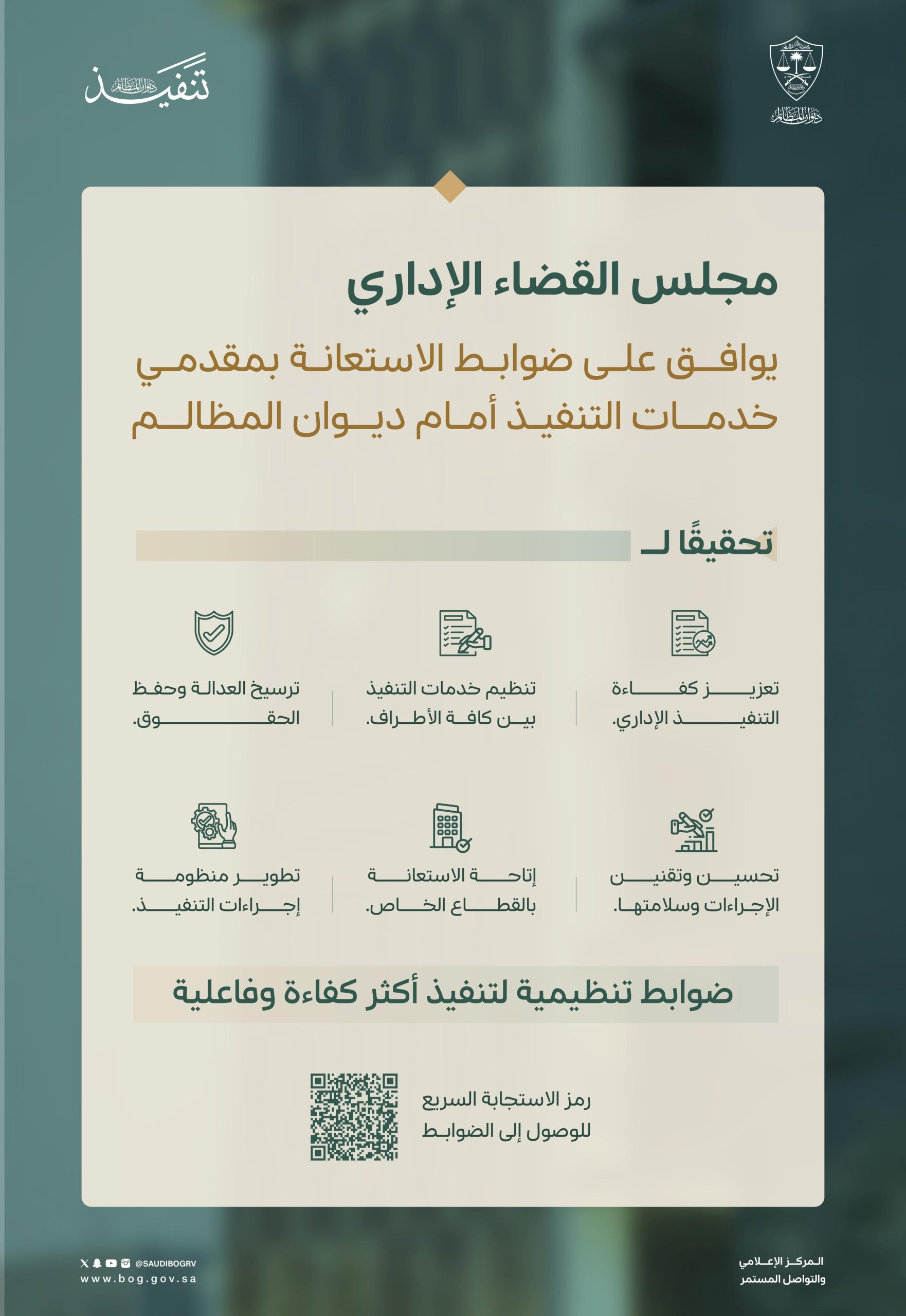 وتأتي هذه الخطوة ضمن جهود الديوان الرامية إلى تطوير منظومة التنفيذ تشريعيًا وإجرائيًا، ورفع مستوى الجودة والموثوقية في أعمال التنفيذ، بما يعزز العدالة الناجزة ويحفظ الحقوق، في إطار مسار مستمر لتحديث بيئة القضاء الإداري ورفع كفاءته المؤسسية.