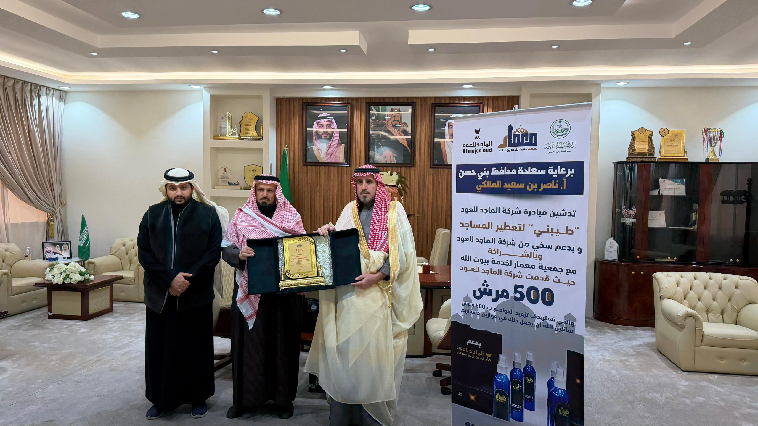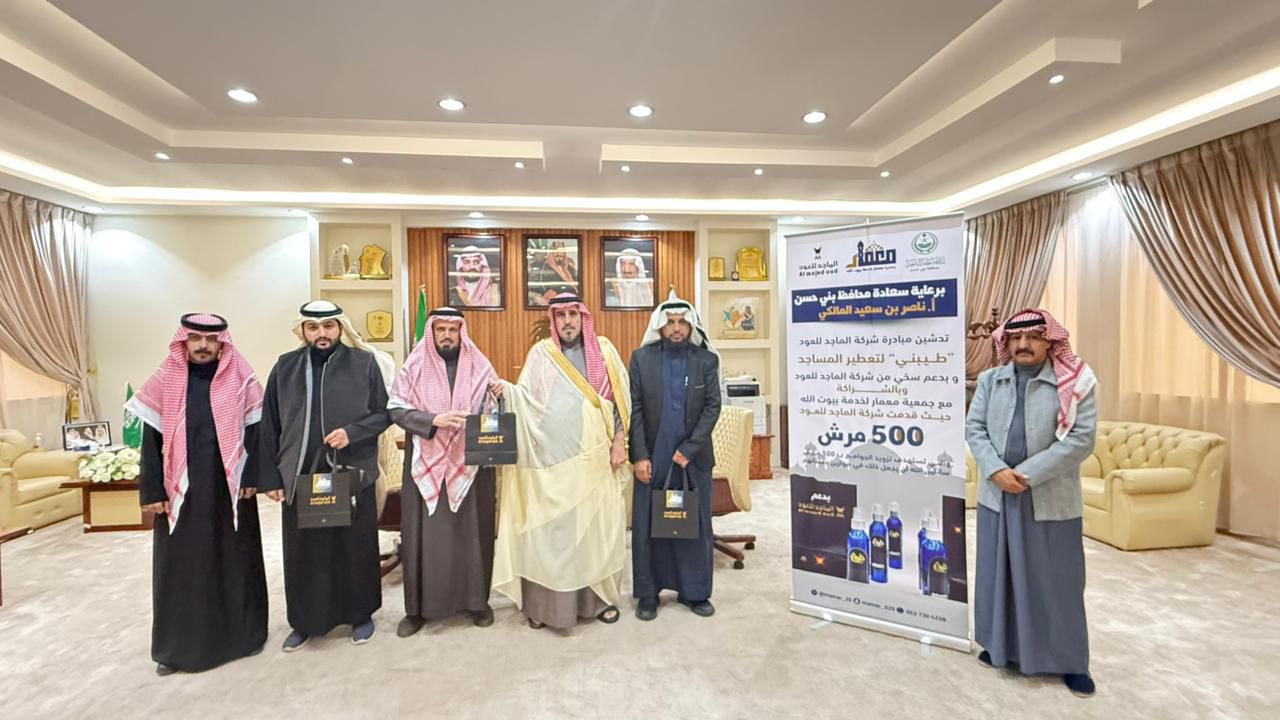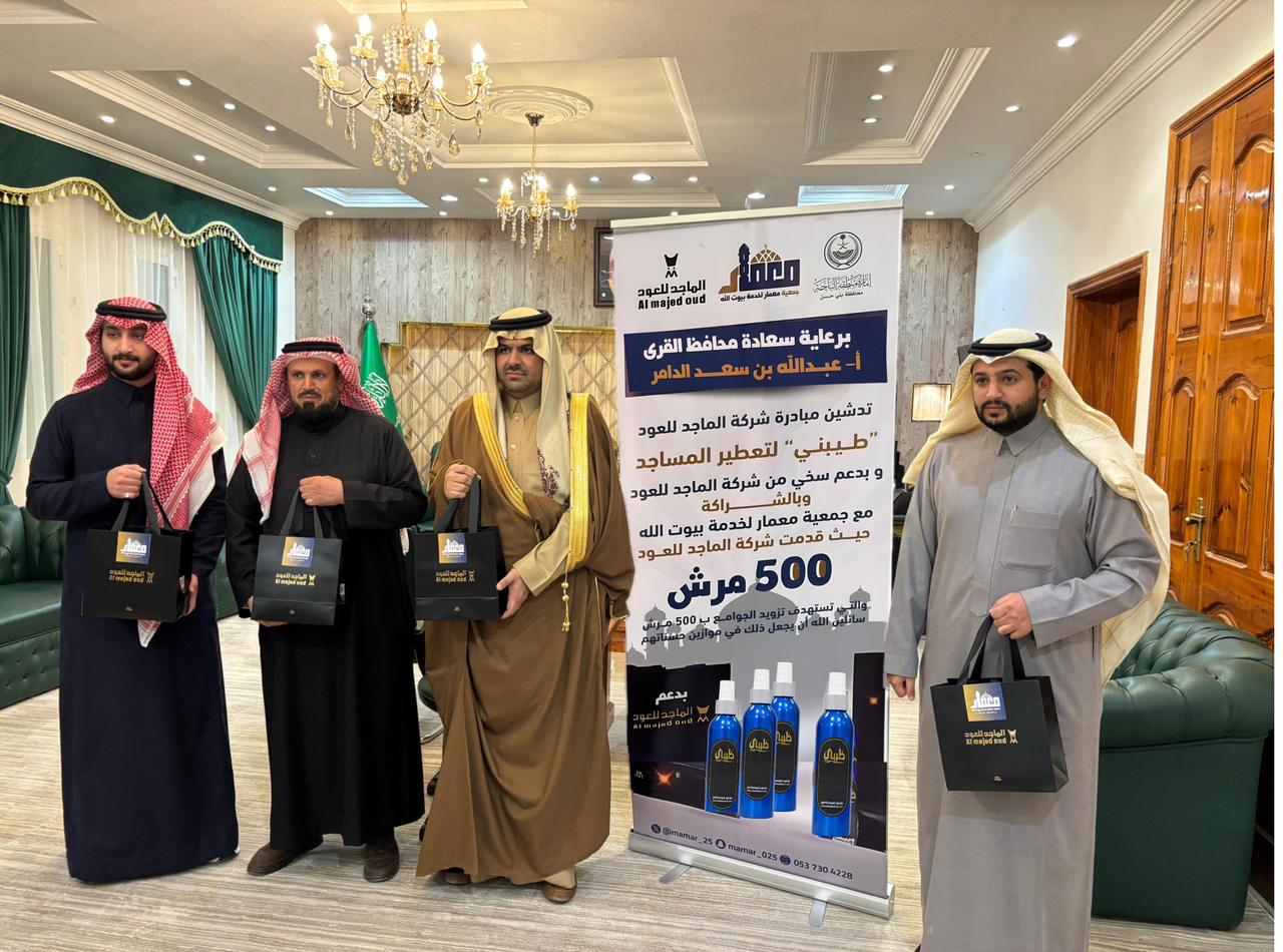 وقدمت شركة الماجد للعود دعماً للجمعية 500 مرشّ معطّر للمساجد ضمن مبادرة “طيبني”، وذلك للإسهام في تهيئة المساجد وتعطيرها وخلق بيئة إيمانية مريحة للمصلين .