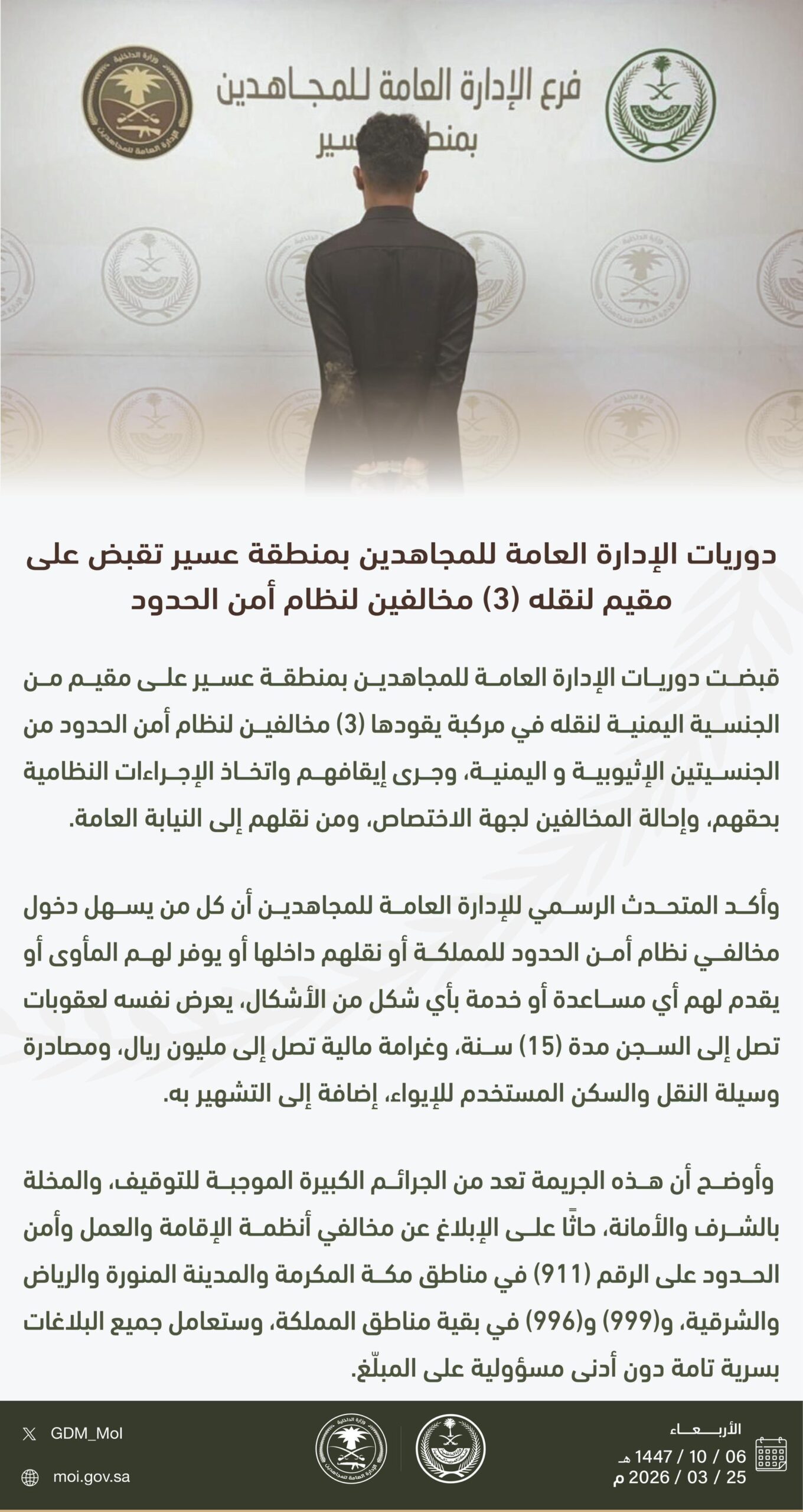 قبضت دوريات الإدارة العامة للمجاهدين بمنطقة عسير على مقيم يمني الجنسية، لنقله ثلاثة مخالفين لنظام أمن الحدود داخل مركبته، من الجنسيتين الإثيوبية واليمنية. وأوقفت الدوريات جميع الأطراف، واتخذت الإجراءات النظامية بحقهم، وأحالت المخالفين إلى جهة الاختصاص، ونقلتهم إلى النيابة العامة. يأتي هذا الضبط ضمن سلسلة من الحملات المكثفة التي نفذتها دوريات المجاهدين بعسير خلال شهر مارس 2026، حيث تمكنت من القبض على عدة أشخاص ينقلون مخالفين، من بينها: