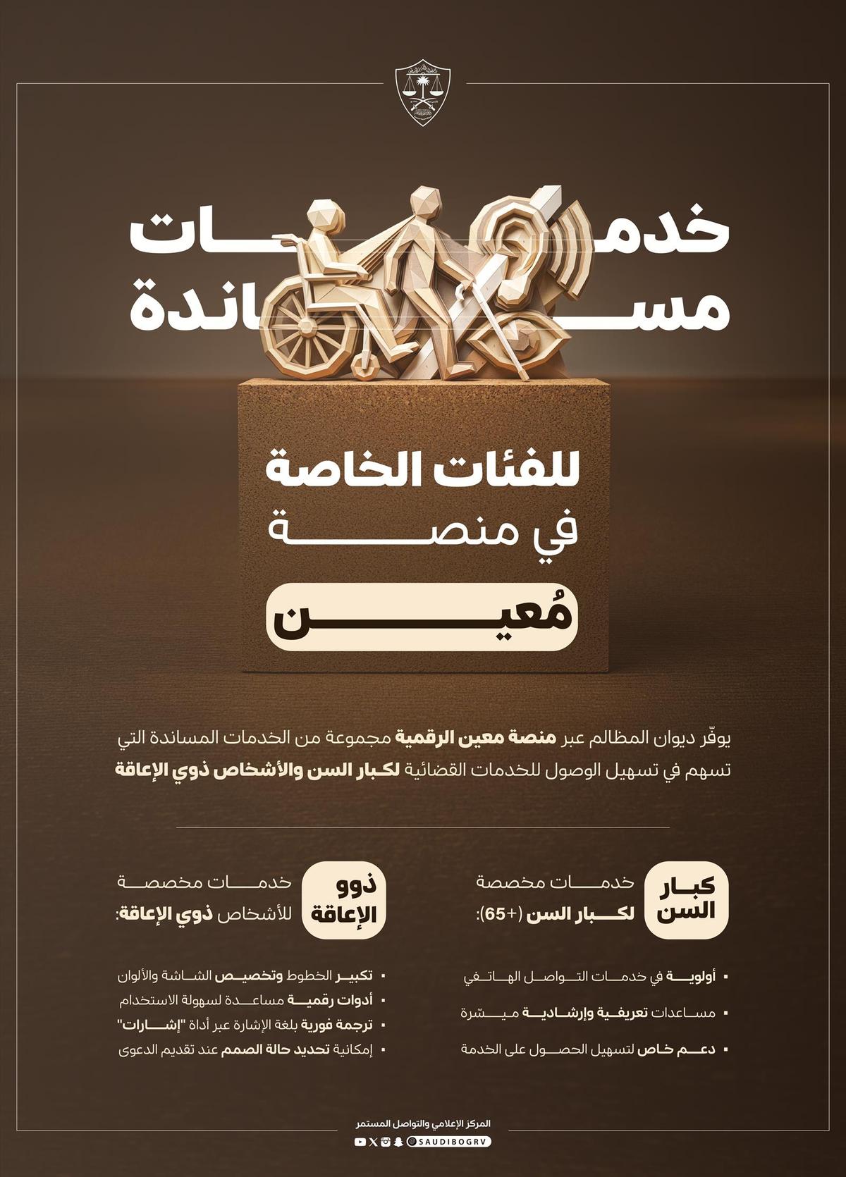 أعلن ديوان المظالم -ممثلًا في مركز إدارة العمليات القضائية- عن إضافة عددٍ من الامتيازات لصالح مستفيدي منصة مُعين الرقمية والبوابة الرقمية وخدمات التواصل من كبار السن والأشخاص ذوي الإعاقة، حيث منحت الامتيازات الحديثة الأولوية لكبار السن في خدمات المستفيدين والمساعدات التعريفية والذكية لمن تجاوزت أعمارهم خمسةً وستين عامًا، شريطة الإفصاح عن ذلك وإثباته.