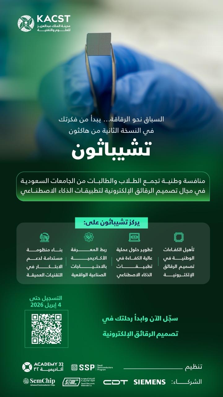أعلنت مدينة الملك عبدالعزيز للعلوم والتقنية “كاكست” عن فتح باب التسجيل في هاكثون تشيباثون بنسخته الثانية، الذي تنظمه أكاديمية 32 بالتعاون مع البرنامج السعودي لأشباه الموصلات، ويعنى بتصميم الرقائق الإلكترونية لتطبيقات مسرعات الذكاء الاصطناعي، الذي يستمر حتى 4 أبريل 2026، ويستهدف الطلاب والطالبات في الجامعات من مختلف مناطق المملكة.