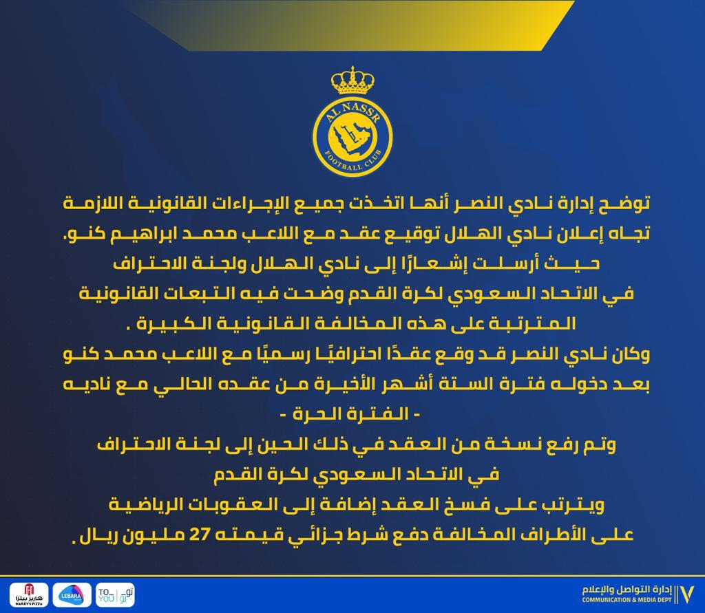 حيث أفادت إدارة النصر انها ستلجأ لتقديم شكوى على اللاعب وناديه الهلال للجنة الاحتراف. وتطالب بدفع اللاعب مبلغ 27 مليون ريال. قيمة الشرط الجزائي. من جهة أخرى افاد المحامي المتخصص في القضايا الرياضية أحمد الأمير على حسابه في تويتر بأنه يترتب على ذلك الانهاء الغير مشروع من قبل كنو عقوبات رياضية وتعويض مالي حسب ما هو متفق عليه في عقده مع النصر