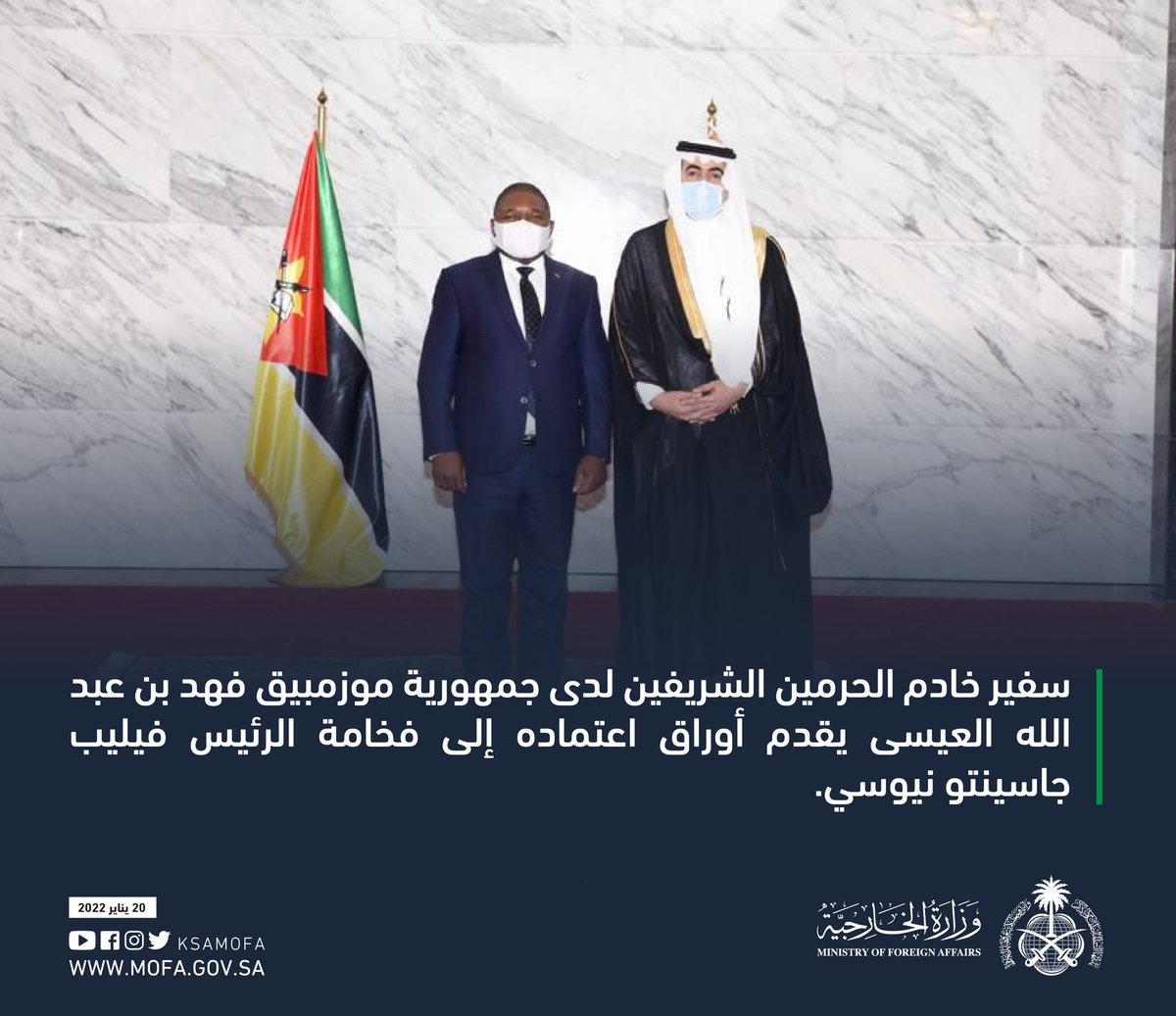 قدم سفير خادم الحرمين الشريفين لدى جمهورية موزمبيق فهد بن عبدالله العيسى، اليوم، أوراق اعتماده لفخامة الرئيس فيليب جاسينتو نيوسي.