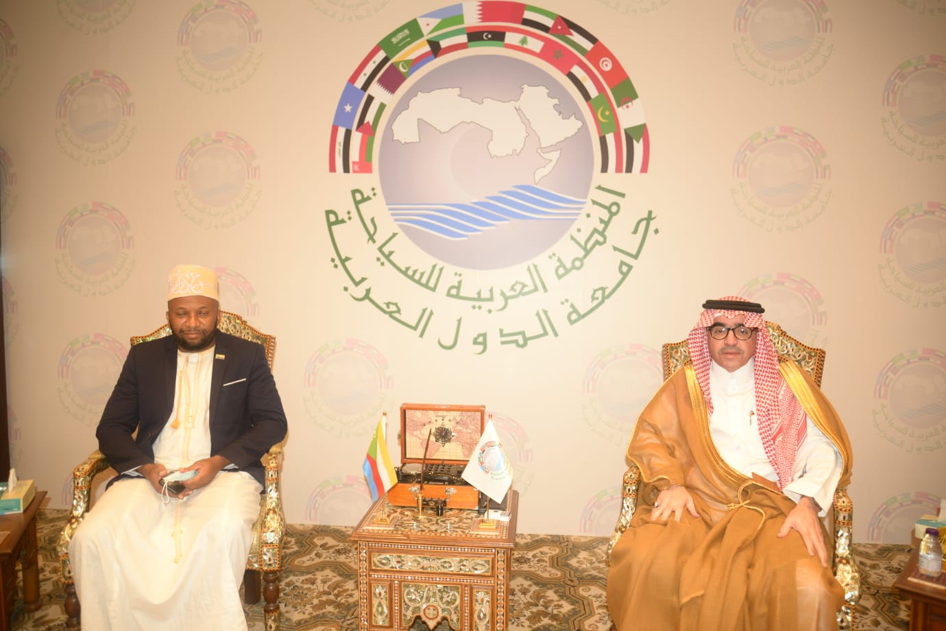 استقبل معالي الدكتور بندر بن فهد آل فهيد رئيس المنظمة العربية للسياحة بمكتبه بمقر المنظمة بجدة معالي الدكتور دانيال علي بندر مدير عام مكتب فخامة رئيس جمهورية القمر المتحدة والوزير بالمجلس الأعلى للحج والعمرة والوفد المرافق له بحضور السفير الحبيب عباس عبدالله السفير فوق العادة والمقيم لجمهورية القمر المتحدة بالمملكة العربية السعودية
