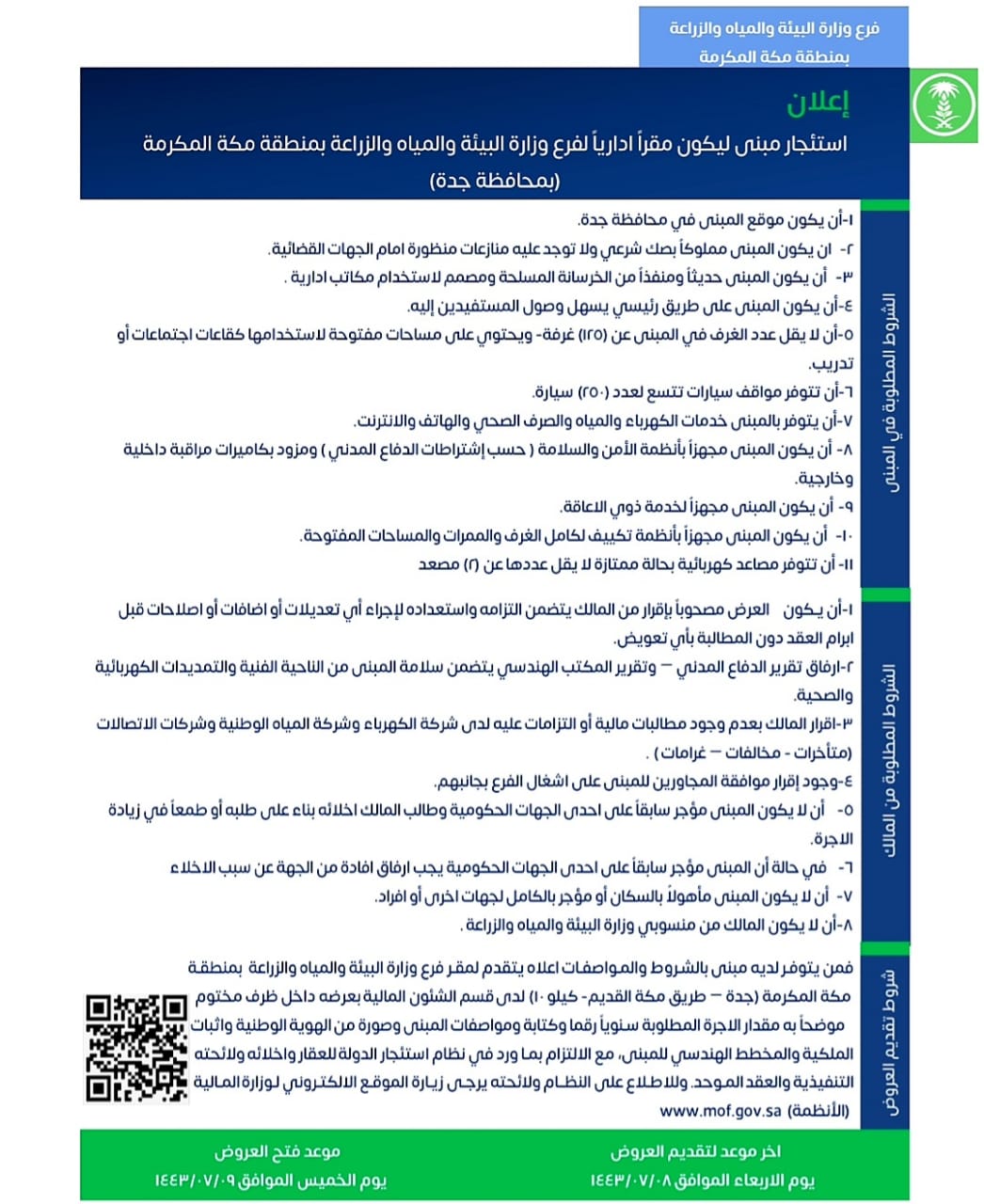 أعلنت وزارة البيئة والمياه والزراعة ، عن رغبتها باستئجار مبنى ليكون مقرا اداريا لفرعها بمنطقة مكة المكرمة (بمحافظة جدة ).