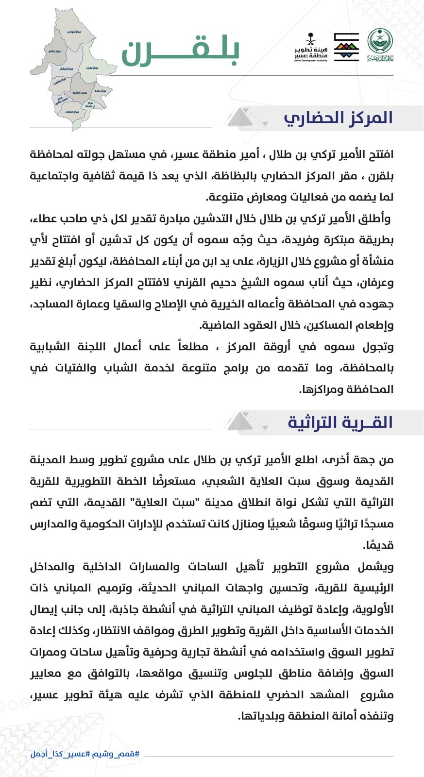 افتتح الأمير تركي بن طلال ، أمير منطقة عسير، رئيس هيئة تطوير المنطقة، في مستهل جولته لمحافظة بلقرن ، مقر المركز الحضاري بالبظاظة، الذي يعد ذا قيمة ثقافية واجتماعية لما يضمه من فعاليات ومعارض متنوعة.