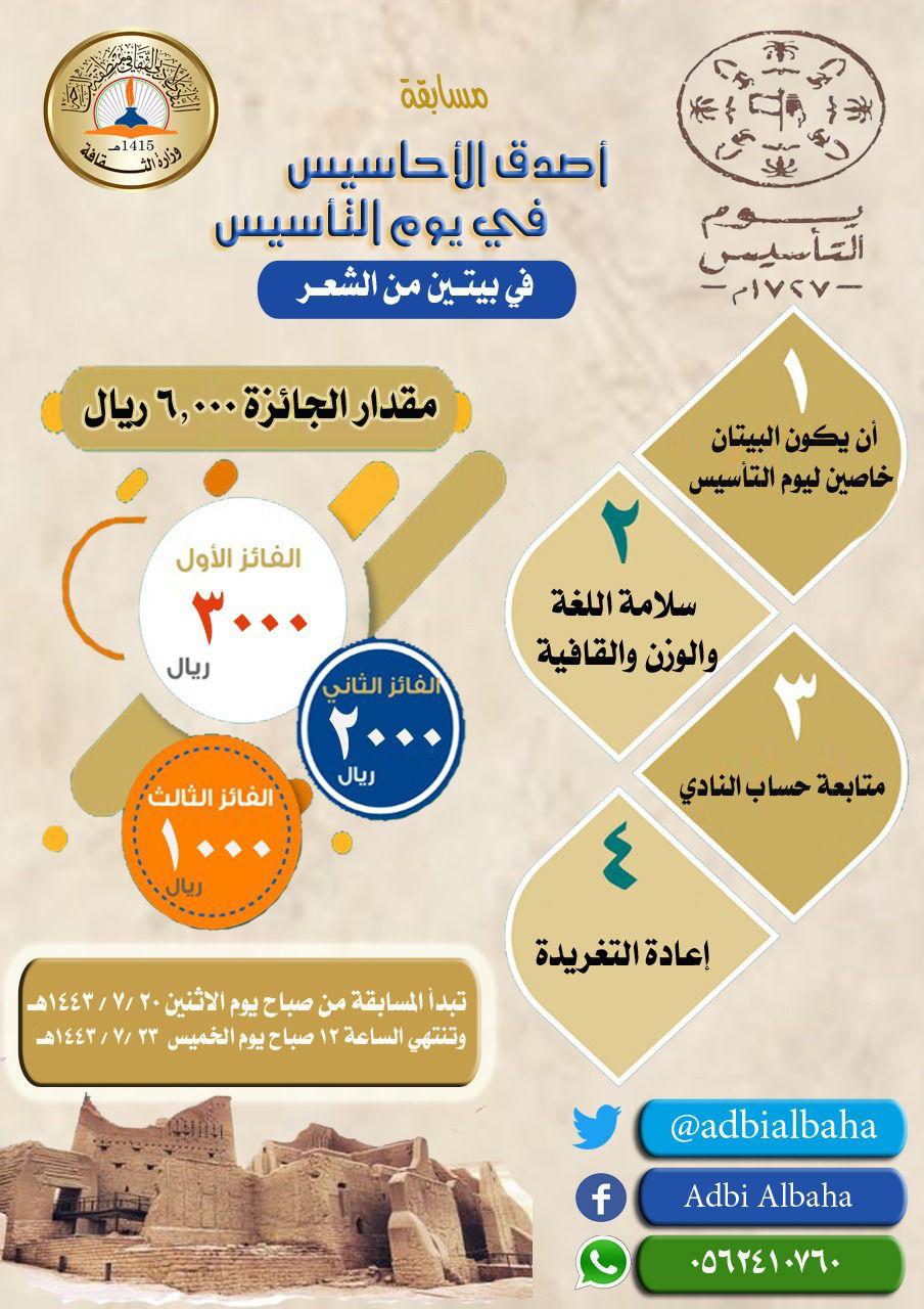 وأوضح رئيس النادي حسن الزهراني أن المشاركة في المسابقة تتم عبر حساب النادي بموقع التواصل الاجتماعي تويتر ،مشيراً إلى أن أبيات المسابقة يشترط ان تكون خاصة بيوم التأسيس وكذلك سلامة اللغة والوزن والقافية ومتابعة حساب النادي واعادة التغريدة وقال رئيس النادي ان مقدار الجائزة 6000 ريال يحصل الفائز الاول على 3000 ريال والمركز الثاني 2000 ريال والمركز الثالث 1000ريال .