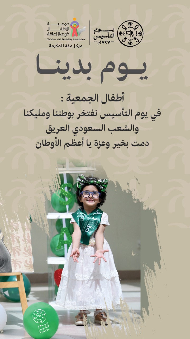 تزامنا مع إحتفالات المملكة العربية السعودية ليوم التأسيس والذي يوافق 22/ فبراير من كل عام، ينظم مركز جمعية الاطفال ذوي الاعاقة بمكة المكرمة حفل لأطفال المركز بعنوان (يوم بدينا)