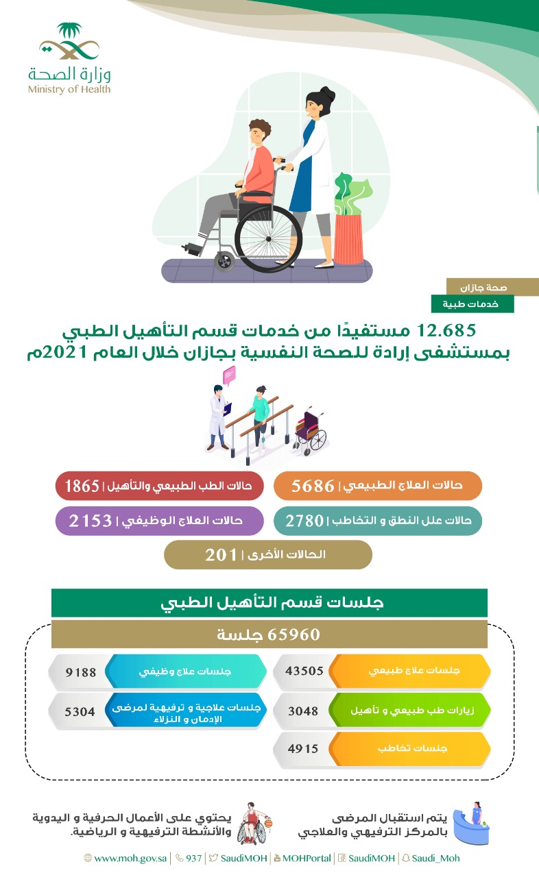 12685 مستفيدًا من خدمات قسم التأهيل الطبي بمستشفى إرادة للصحة النفسية بجازان خلال العام 2021م