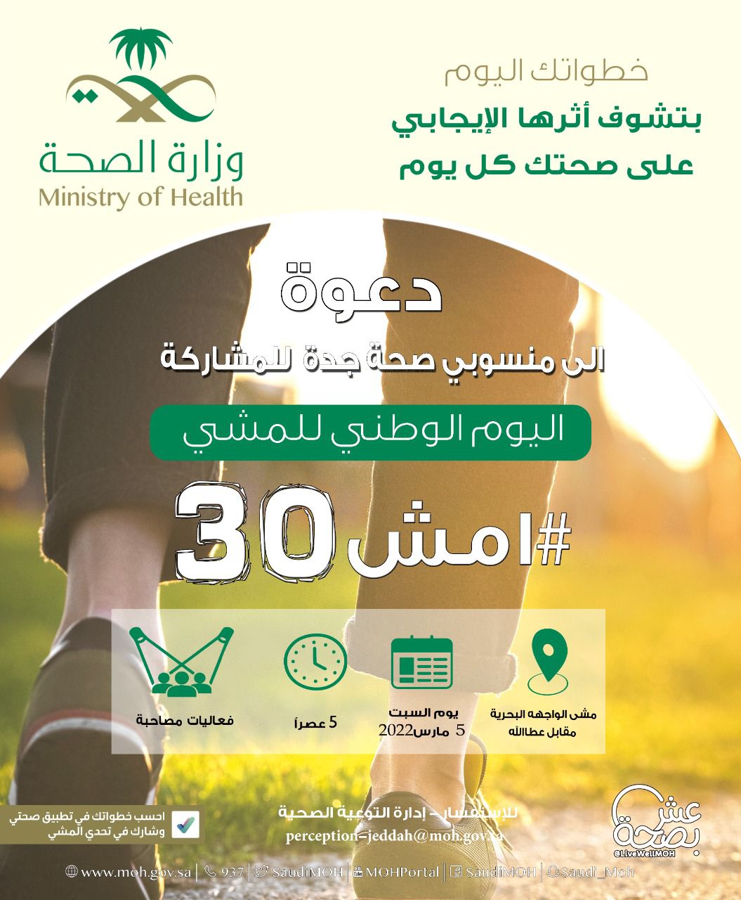 تطلق صحة جدة يوم السبت القادم فعالية رياضة المشي في ممشى الواجهة البحرية ، تزامنًا مع حملة اليوم الوطني للمشي ، التي أطلقتها وزارة الصحة في جميع أنحاء المملكة تحت شعار « امشِ 30 » .