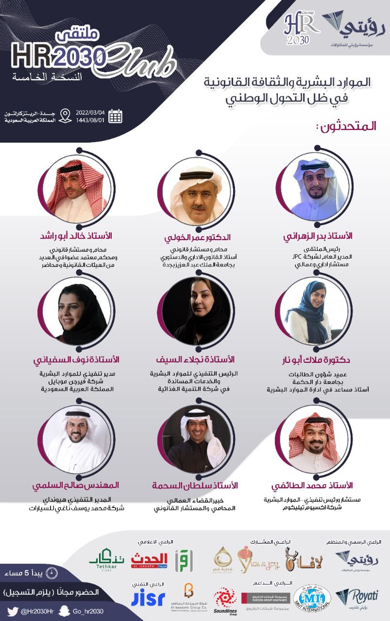 تستضيف جدة ملتقى HR2030 CLUB بنسخته الخامسة، يوم الجمعة 04/03/2022 م في فندق الريتز كارلتون بجدة، بقيادة الموارد البشرية ورجال القانون في الملتقى السنوي والذي يترأسهُ الأستاذ بدر الزهراني بعنوان