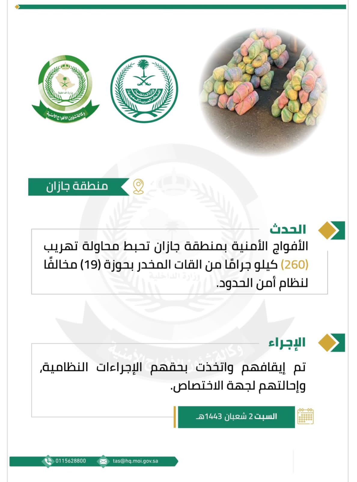الأفواج الأمنية بمنطقة جازان ضبطت (19) مخالفًا لنظام أمن الحدود من الجنسية اليمنية، بحوزتهم (260) كيلو