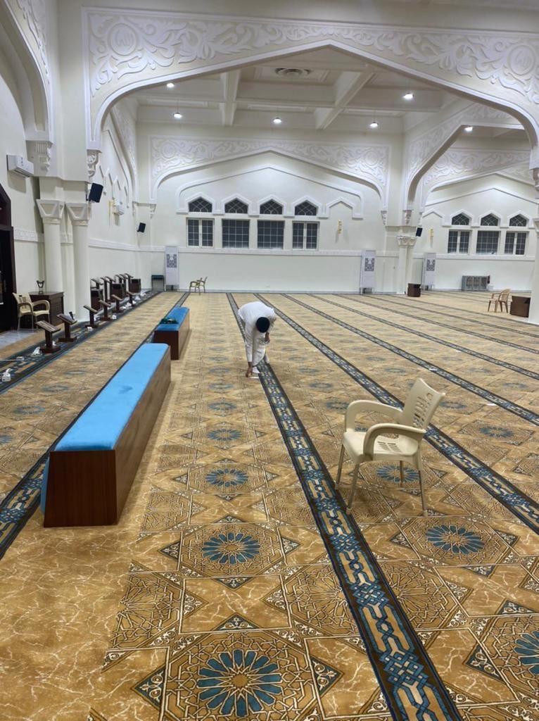 المساجد تباشر إزالة ملصقات التباعد تزامنًا مع عودة التراص والتقارب بصفوف المصلين