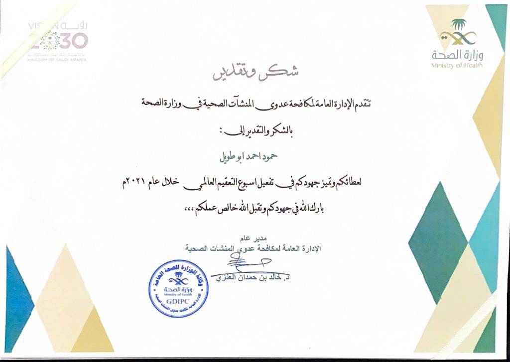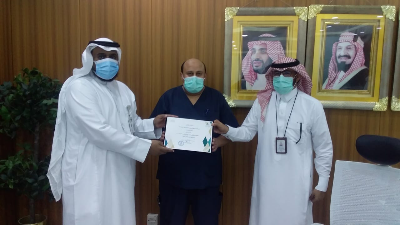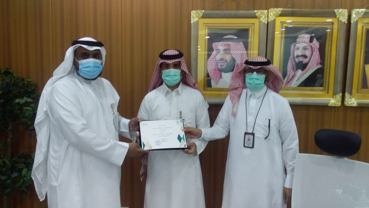 كرم مدير مستشفى صامطة العام الأخصائي يحيى حمد مهدي وبحضور المشرف على أقسام التعقيم المركزي بصحة جازان الأستاذ محمد الحازمي، رئيس قسم التعقيم بالمستشفى الأستاذ فهد قحل وموظف قسم التعقيم الأستاذ حمود أبو طويل وذالك تقدير من الإدارة العامة لمكافحة عدوى المنشآت الصحية في وزارة الصحة.