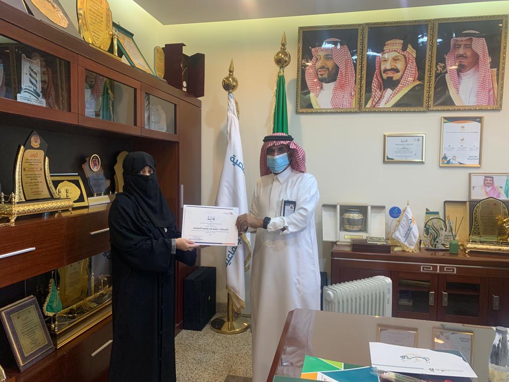 كما هنئ سعادة المدير العام الزميلة الأستاذة مارية محسن المحمدي مشرفة المبادرات والتدريب سفيرة التميز المؤسسي بالفرع على تكليفها بمنصب “مقيم معتمد” في المؤسسة الأوربية للجودة ضمن عدد من سفراء التميز المؤسسي بالوزارة على مستوى المملكة بالإضافة الى اختيارها عضو في فريق الابداع والابتكار المؤسسي في الوزارة والذي يضم نخبة من الموظفين المبدعين والمبتكرين والموهوبين وذوي الأداء العالي بالوزارة حاثا إياها بذل المزيد من الجهد والعطاء بما يتناسب مع هذه المهام و تقدم كلا من الزميلين المكرمين بخالص الشكر والتقدير لسعادة المدير العام على حرصه ودعمه وتشجيعه الحثيث والدائم.