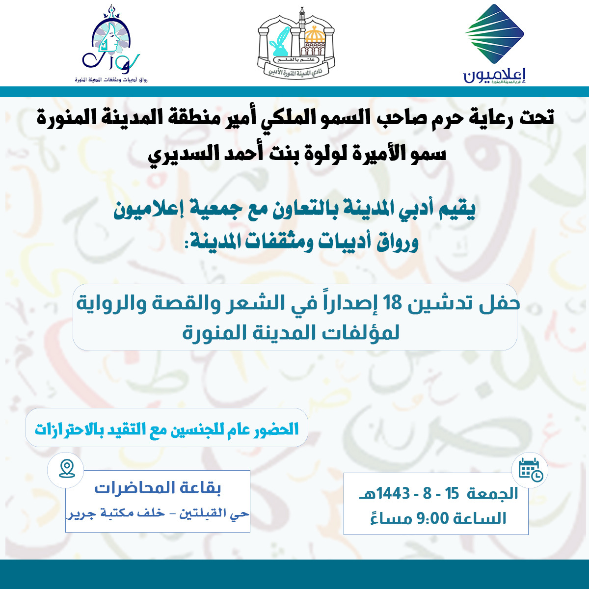 ترعى حرم صاحب السمو الملكي أمير منطقة المدينة المنورة سمو الأميرة لولوة بنت أحمد السديري تدشين 18 إصدار أدبي نسائي في الرواية والقصة والشعر ينفذه وينظمه القسم النسائي بأدبي المدينة بالتعاون مع جمعية إعلاميون ورواق أديبات المدينة في ثاني عرس أدبي ينظمه النادي في تدشين إصدارات أدبية نسائية سابقة .