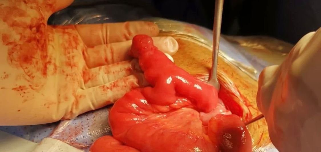 جراحة عاجلة لاستئصال كيس ميكلز من الأمعاء لمريض عشريني.