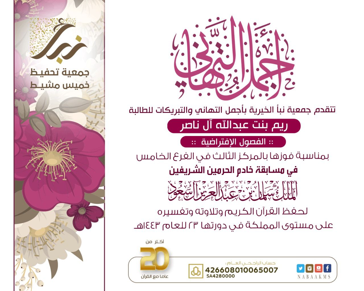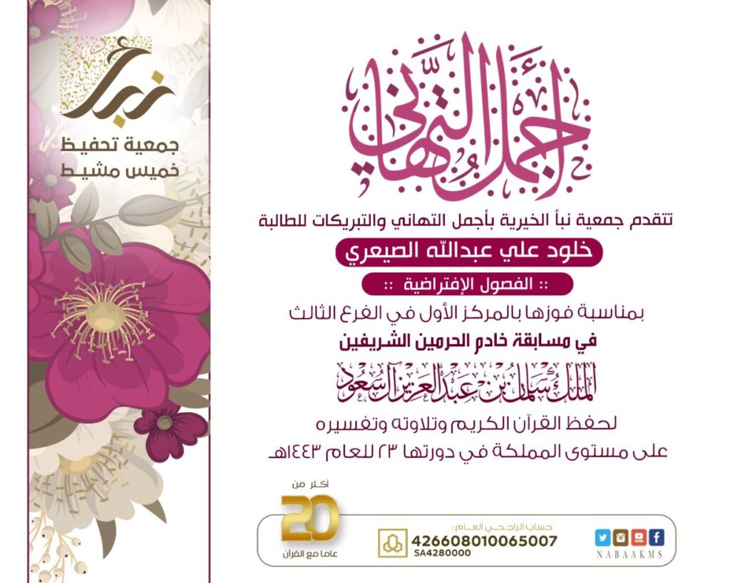 هنأت جمعية نبأ الخيرية لتحفيظ القرآن الكريم بخميس مشيط ممثلة بمجلس إدارة الجمعية، وإدارتها التنفيذية وجميع منسوبيها ومنسوباتها في الكادر التعليمي، الطالبة: خلود الصيعري الفائزة بالمركز الأول في الفرع الثالث من مسابقة خادم الحرمين الشريفين المحلية لحفظ القرآن الكريم