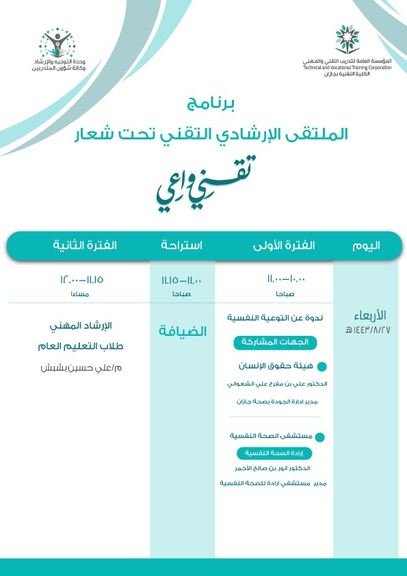 نظمت المؤسسة العامة للتعليم المهني والتقني بخيمة الأمير محمد بن ناصر وبالتعاون مع وزارة الصحة وهيئة حقوق الإنسان برنامجا تثقيفيا وتوعويا عن أساليب التعليم المهنية و الصحية والحقوق العامة للأفراد التي كفلتها الدولة وأمنتها لهم، والوسائل التعليمية والتربوية والثقافية التي تعزز ذلك،
