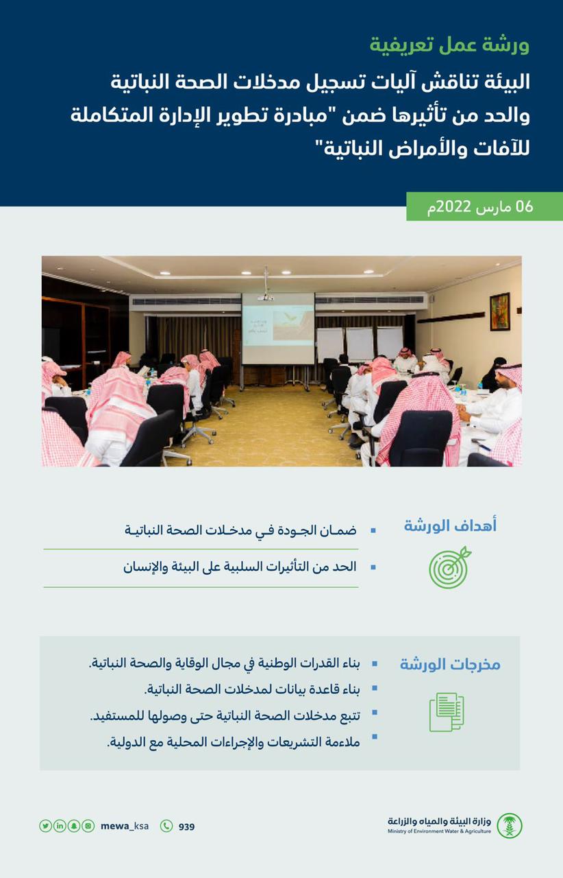 وأوضح مدير عام الإدارة العامة لصحة ووقاية النبات بالوزارة المهندس أيمن الغامدي، أن الورشة بحثت آلية تسجيل وتتبع الأعداء الحيوية وتقييم فعاليتها، وتحديث آلية تسجيل المبيدات الزراعية وإعادة تسجيلها، بالإضافة إلى إعداد آلية للتخلص من المبيدات منتهية الصلاحية٠