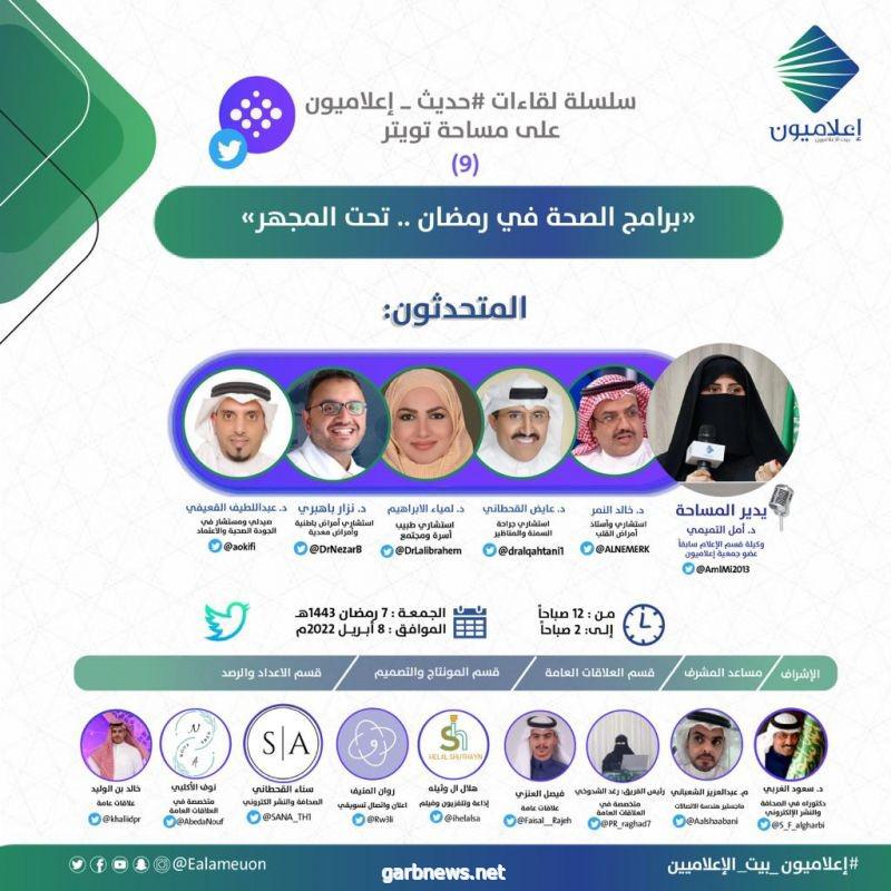 تنظم جمعية إعلاميون عبر مساحتها على تويتر حديث إعلاميون التاسع صباح اليوم الجمعة السابع من رمضان 1443هـ، وذلك تحت عنوان برامج الصحة الإعلامية في رمضان.. تحت المجهر.. ويمكن الدخول عليها من خلال الرابط: