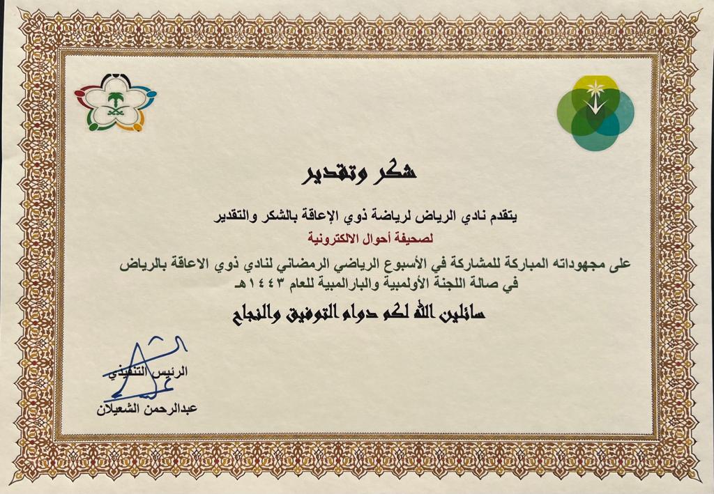 توالت نجاحات صحيفة أحوال الإلكترونية من خلال تغطياتها ونشر الأخبار التي تخص المجتمع ، ومن إحدى هذه النجاحات حصولها على شهادة شكر وتقدير من نادي الرياض لرياضة ذوي الإعاقة على التغطية الإعلامية للأسبوع الرياضي الرمضاني لنادي الرياض لذوي الإعاقة والتي أقيمت في صالة اللجنة الأولمبية والبارالمبية ، وقد مثل الصحيفة في هذه البطولة مدير مكتب أحوال بالمنطقة الوسطى الإعلامي الأستاذ : محمـد قرهم وعضوة العلاقات العامة للصحيفة بالرياض الأستاذة : حكمة الشهري .