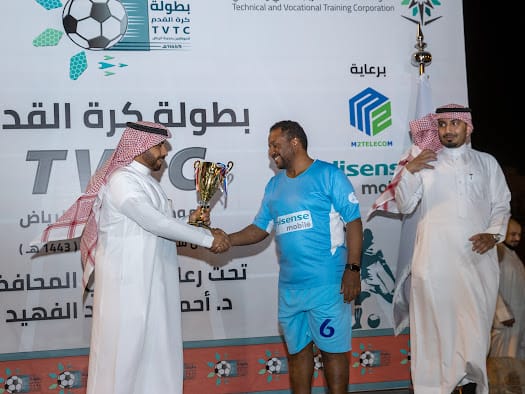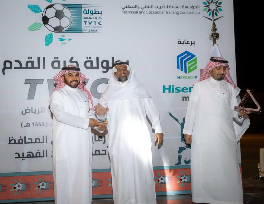 توج معالي محافظ المؤسسة العامة للتدريب التقني والمهني الدكتور أحمد بن فهد الفهيد فريق إدارة الموارد البشرية بعد فوزه على فريق إدارة الاتصالات الإدارية بنتيجة 3 أهداف مقابل هدف واحد في المباراة النهائية لبطولة كأس المؤسسة العامة للتدريب التقني والمهني لكرة القدم للموظفين ، فيما جاء فريق كلية الاتصالات والمعلومات بالرياض في المركز ونال الأستاذ عبدالله الحمدة من الكلية جائزة أفضل لاعب في البطولة ، كما كرم معاليه الأستاذ عمر باوزير المسئول عن شركة مشاعل العاصمة والوكيل الحصري لشركة هايسنس لرعايتة للبطولة.