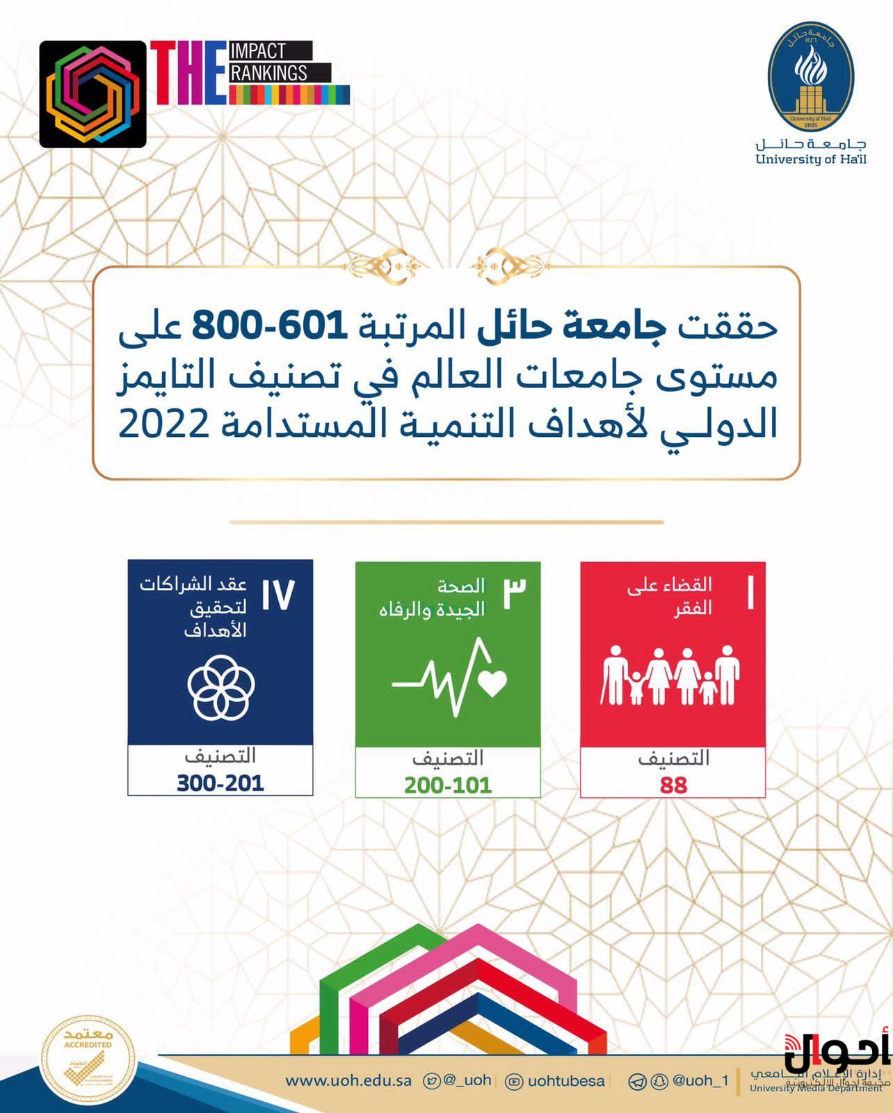 حققت جامعة حائل الترتيب 601-800 عالمياً في تصنيف التايمز الدولي في إطار تأثير الجامعات العالمية 2022، الذي يقيس أداء الجامعات بناء على أهداف الأمم المتحدة للتنمية المستدامة (SDG)،وعددها 17 هدفًا.