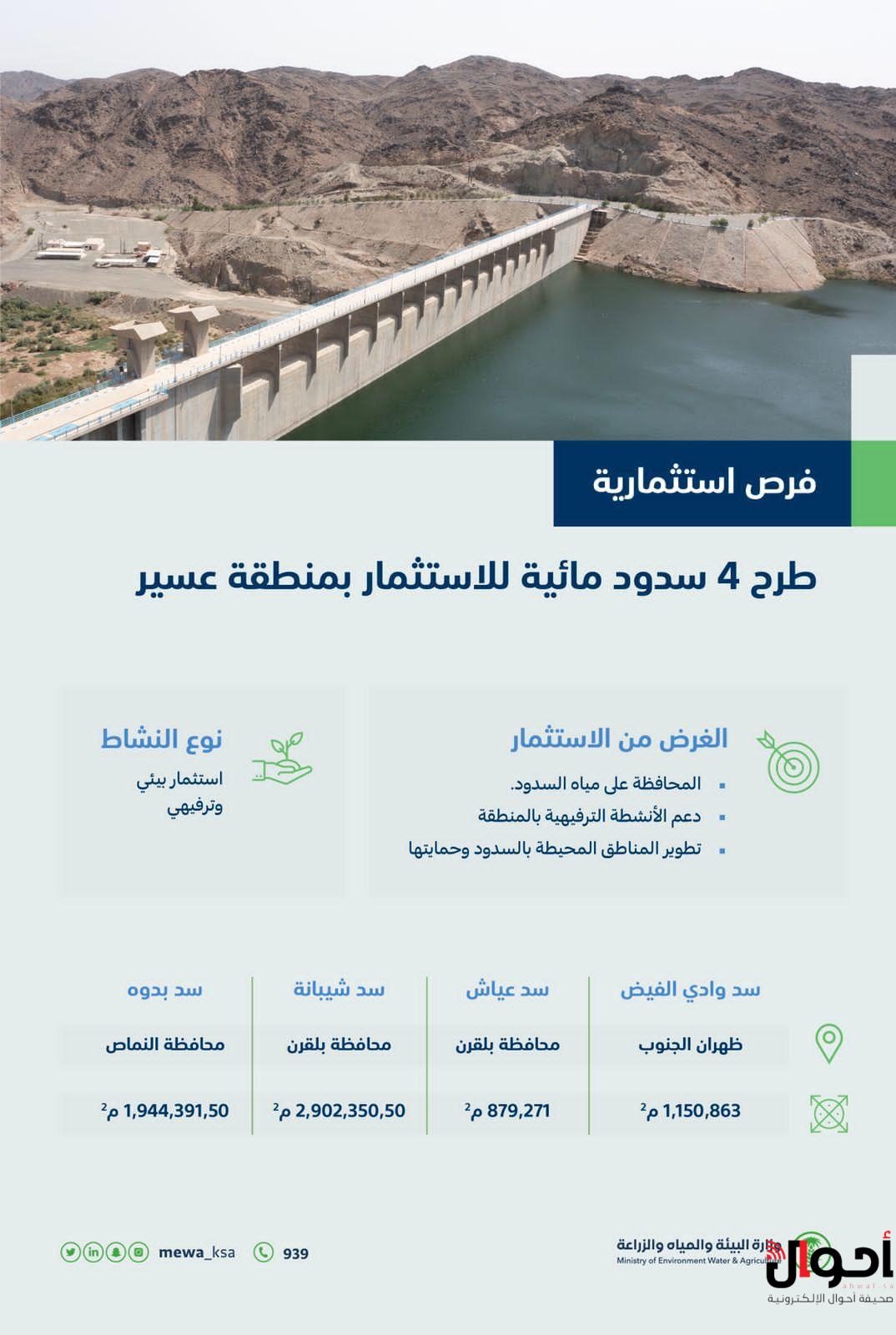 وأوضحت الوزارة أن الفرص الاستثمارية الأربع بالمنطقة، والتي تمثلت في طرح سد وادي الفيض الواقع شمال شرق محافظة ظهران الجنوب، وتقدر مساحته الإجماليةـ 1,150,863 م2، وسدين بمحافظة بلقرن، هما سد عياش بمساحة إجمالية تقدر بـ 879,271 م2، وكذلك سد شيبانة بمساحة إجمالية تبلغ 2,902,350,50 م2، بالإضافة إلى سد بدوه بمحافظة النماص بمساحة إجمالية بلغت نحو 1,944,391,50 م2