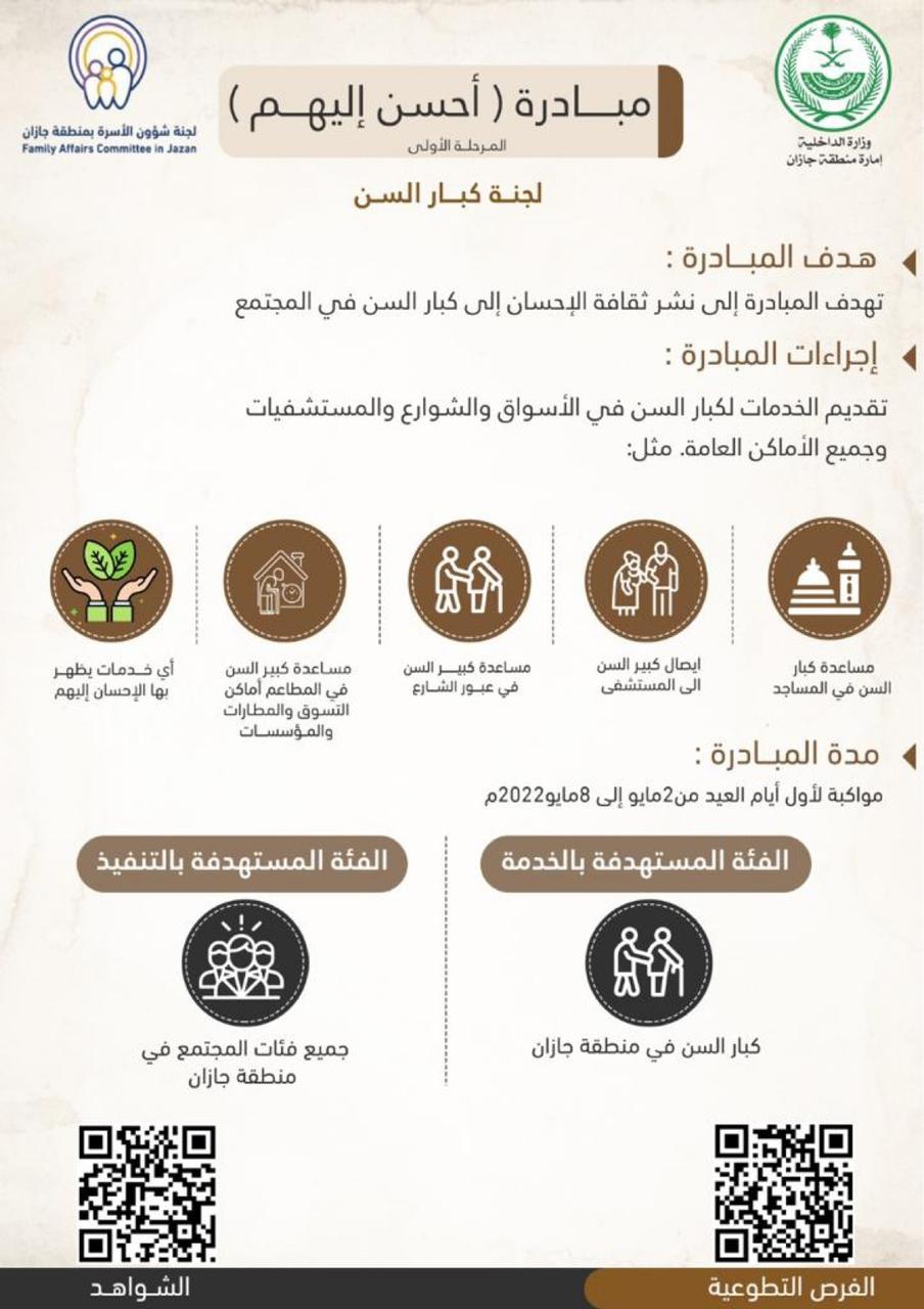 أطلقت لجنة شؤون الأسرة بمنطقة جازان ممثلة بلجنة كبار السن، صباح أول أيام عيد الفطر المبارك ، مبادرة “أحسن إليهم “. في مرحلتها الأولى.