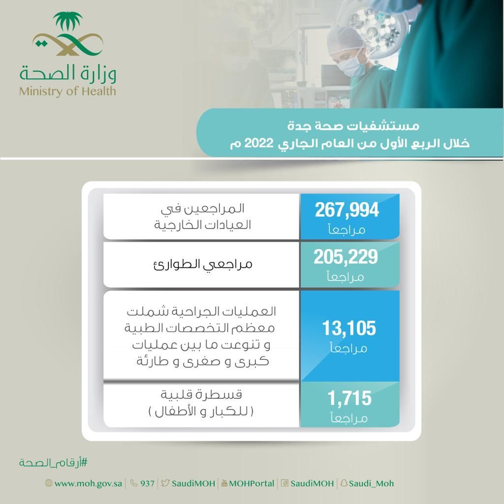 كشفت صحة جدة في إحصائية حديثة أن عدد المراجعين في العيادات الخارجية بمستشفياتها خلال الربع الأول من العام الجاري ٢٠٢٢ م بلغ ( ٢٦٧,٩٩٤ ) مراجع ، في حين بلغ عدد مراجعي الطوارئ لنفس الفترة بمستشفيات صحة جدة بلغ ( ٢٠٥,٢٢٩ ) مراجع قُدمت من خلالها لهم مختلف أنواع الخدمات العلاجية .