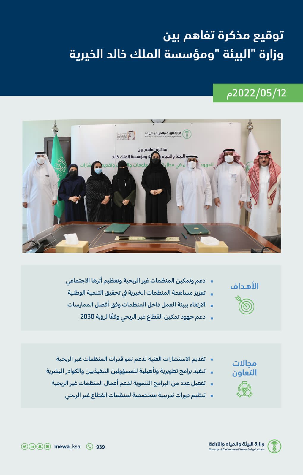 وقعت وزارة البيئة والمياه والزراعة ومؤسسة الملك خالد الخيرية اليوم مذكرة تفاهم تهدف إلى دعم المنظمات غير الربحية، وتعظيم أثرها الاجتماعي، وتعزيز مساهمتها في تحقيق برنامج التنمية الوطني الشامل، والارتقاء ببيئة العمل في هذه المنظمات وفق أفضل الممارسات المتبعة وتحسين الأداء وفقاً لرؤية المملكة 2030.