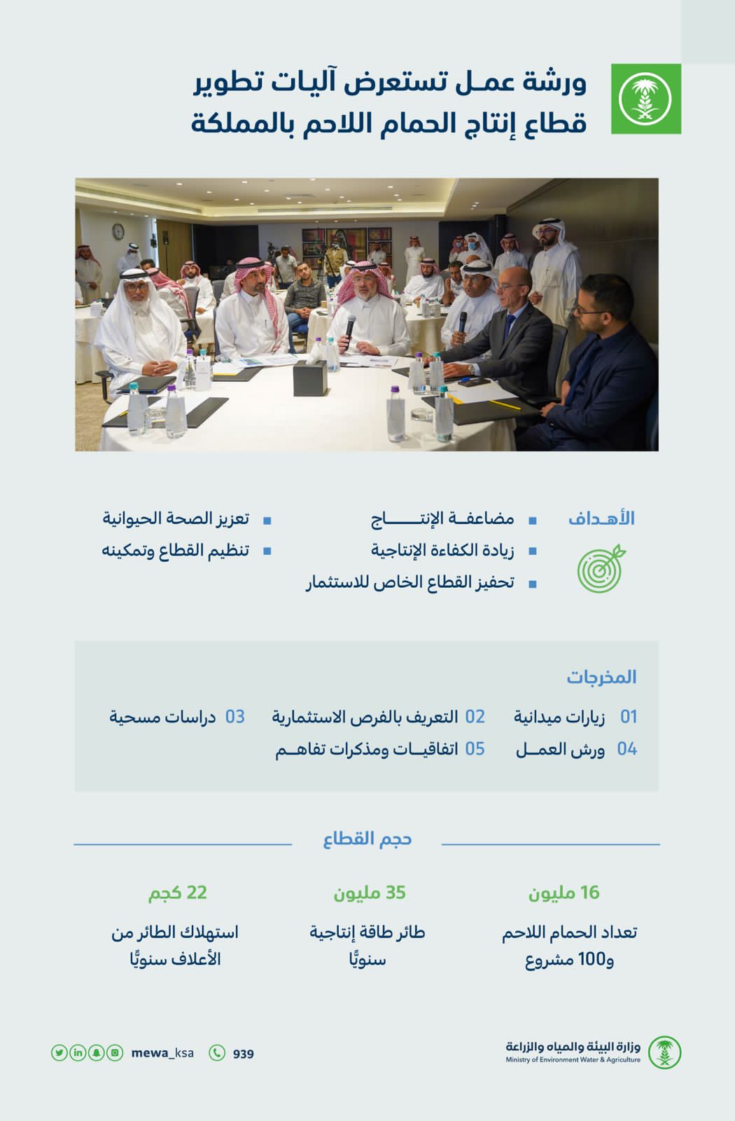 وأبان العيادة أن الوزارة تعمل منذ أكثر من عام ونصف العام، على اعتماد خطة لتطوير قطاع إنتاج الحمام اللاحم بالمملكة، تهدف إلى مضاعفة الإنتاج، وزيادة الكفاءة الإنتاجية بنسبة 100%، وأيضًا مساعدة القطاع الخاص على توقيع بعض مذكرات التفاهم، مشيرًا إلى أن الوزارة أجرت مسحًا شاملًا لإنتاج الحمام اللاحم بمناطق المملكة المختلفة؛ أسفر عن وجود فرصٍ كبيرة أمام المستثمرين في هذا القطاع.